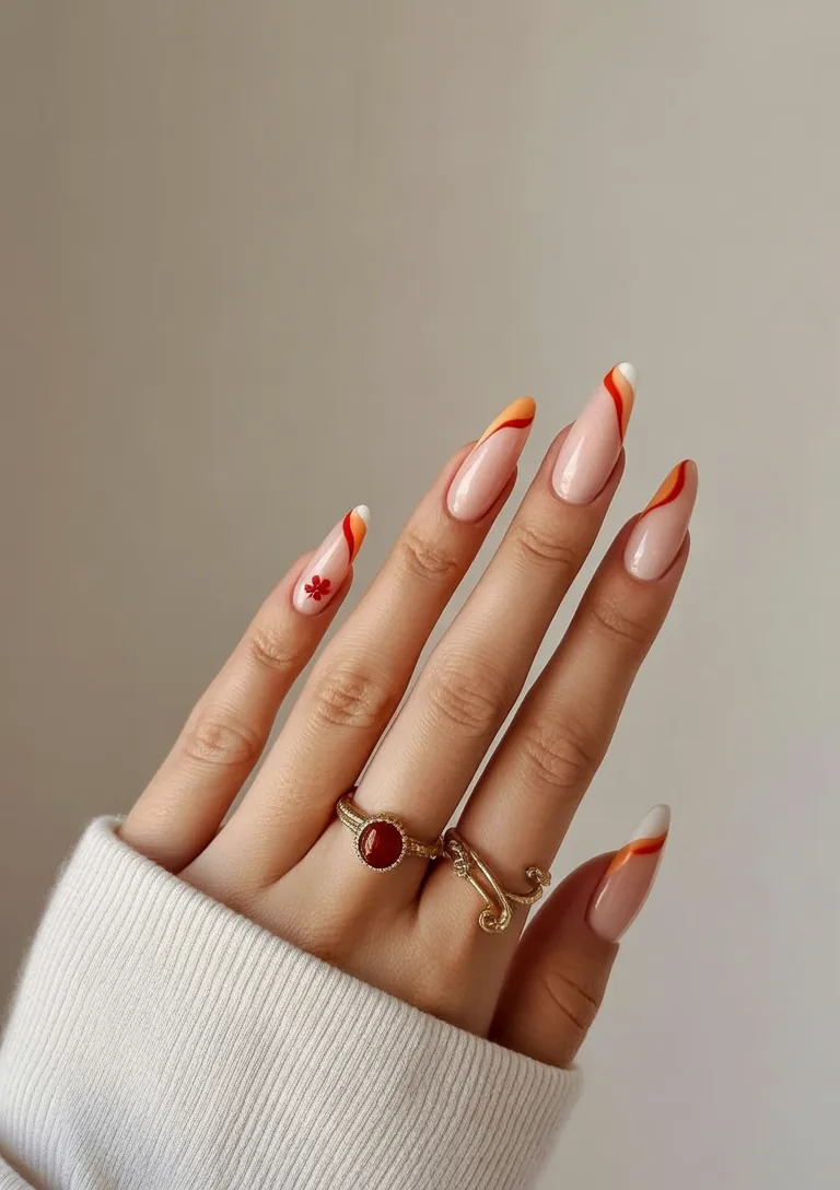 16. Orange and Red Floral Almond Nails