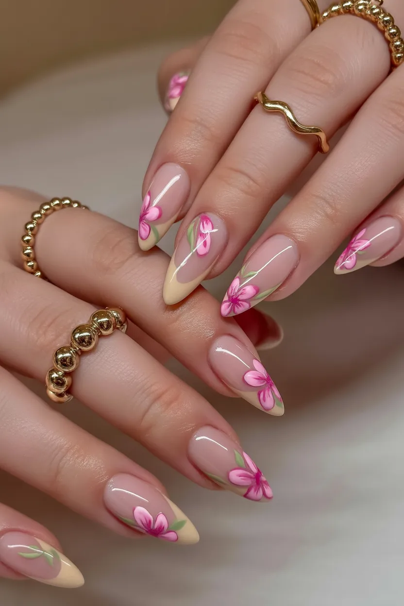 11. Elegant Nude Almond Nails with Pink Floral Art