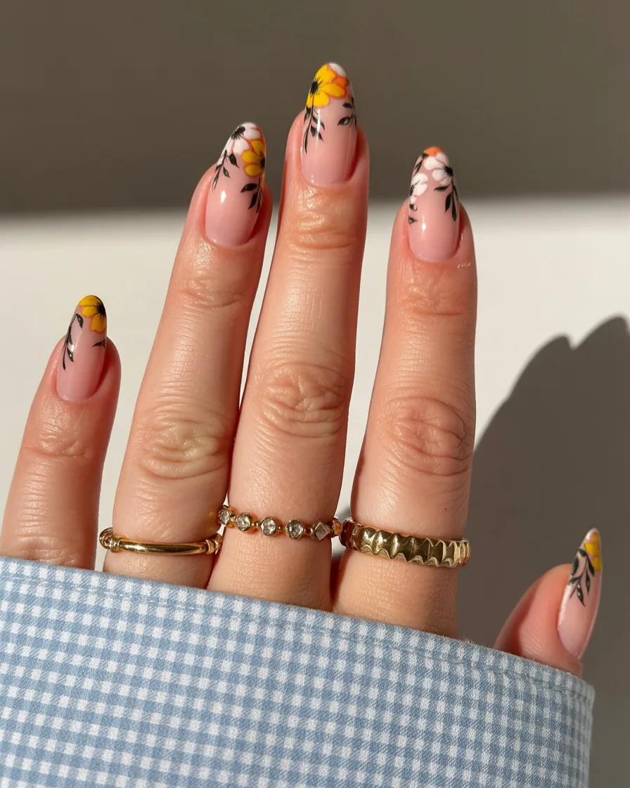 This style works beautifully for medium to long almond-shaped nails and is especially flattering on warmer skin tones. If you love Ideas almond but want something wearable for everyday life, this is a great balance. Stick to soft Colors like peach, coral, and muted green, and ask for hand-painted Art rather than heavy decals to keep it refined. A glossy topcoat keeps everything looking polished while still feeling light and Simple.