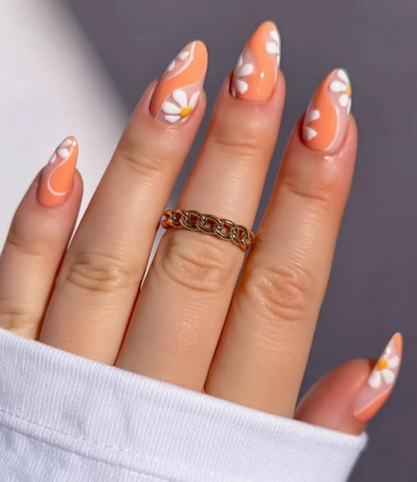 22. Peachy Nude Nails with Orange Daisy Accents