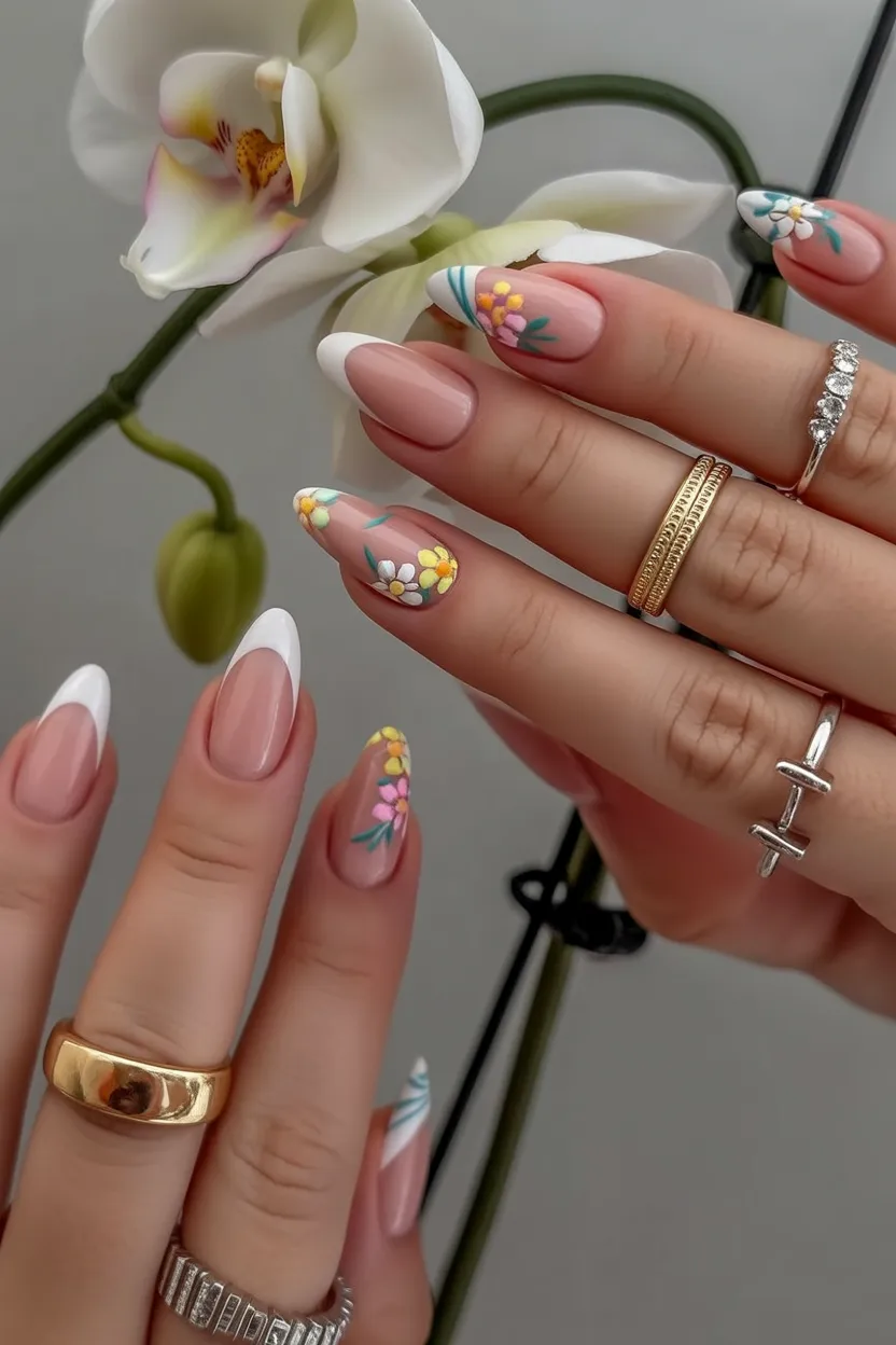 20. Soft French Almond Nails with Pastel Floral Accents