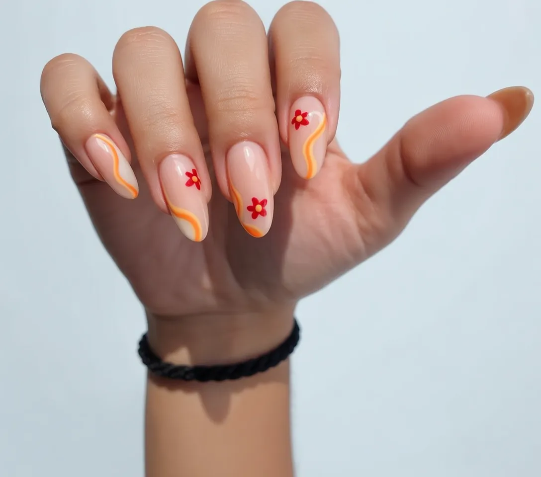 9. Minimal Nude Nails with Orange Wave Accents