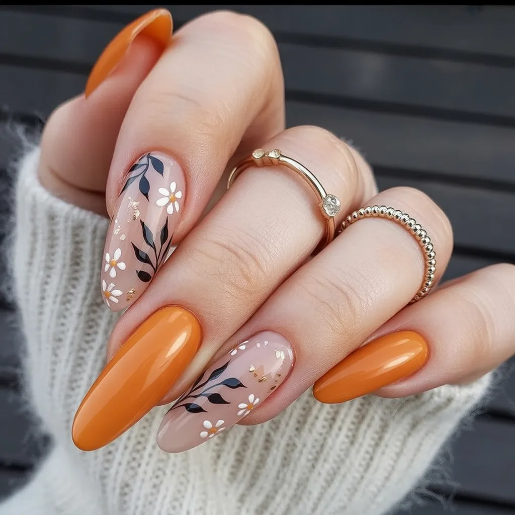 19. Warm Orange Almond Nails with Botanical Florals