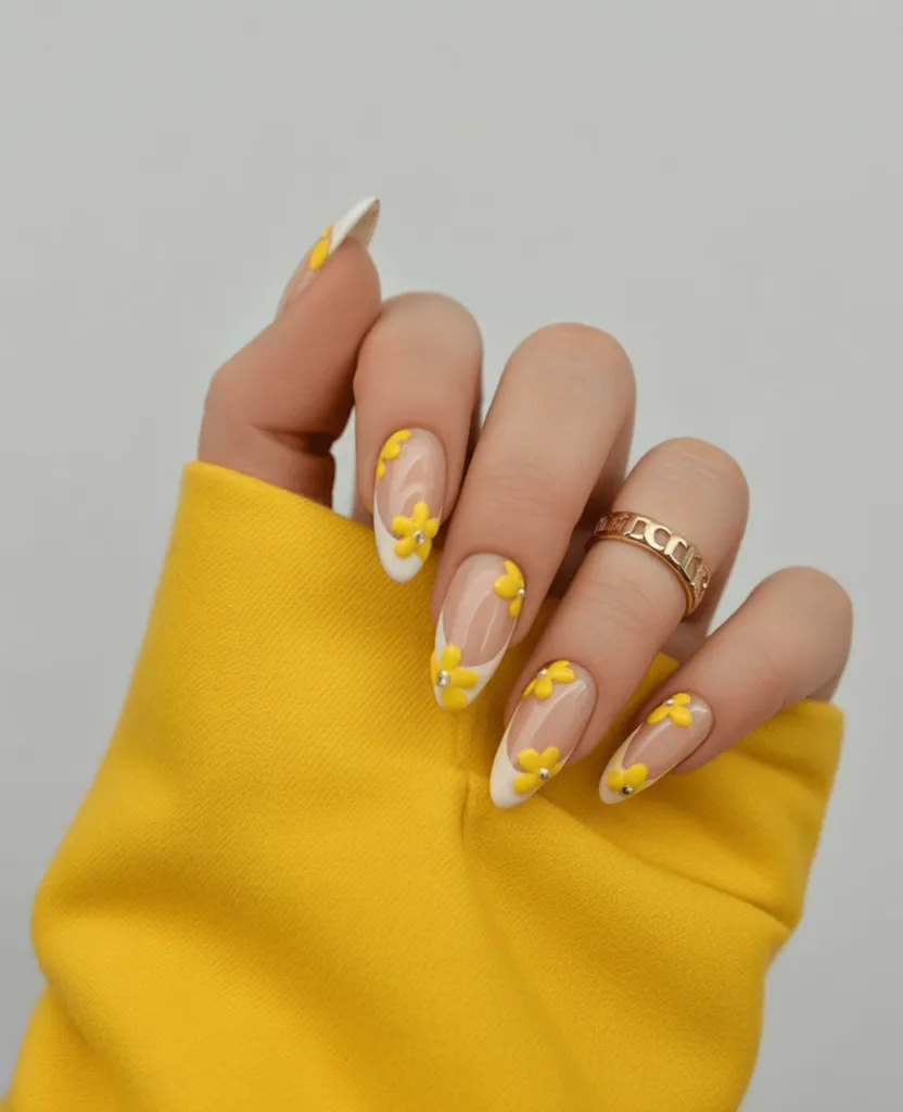 21. Yellow Daisy French Tips with a Playful Touch