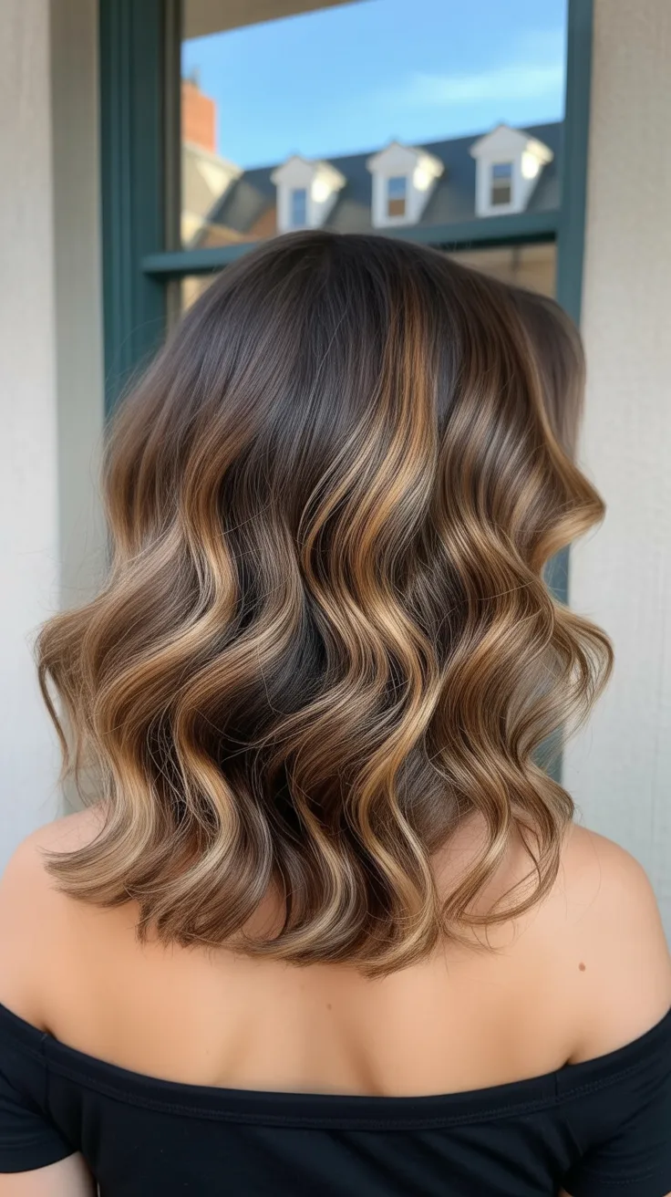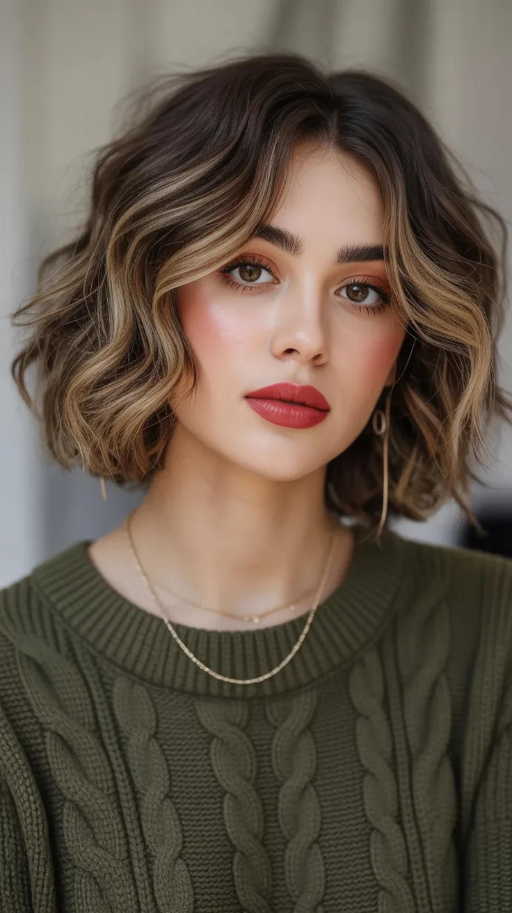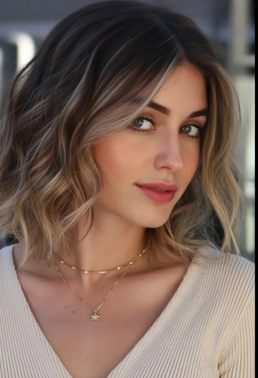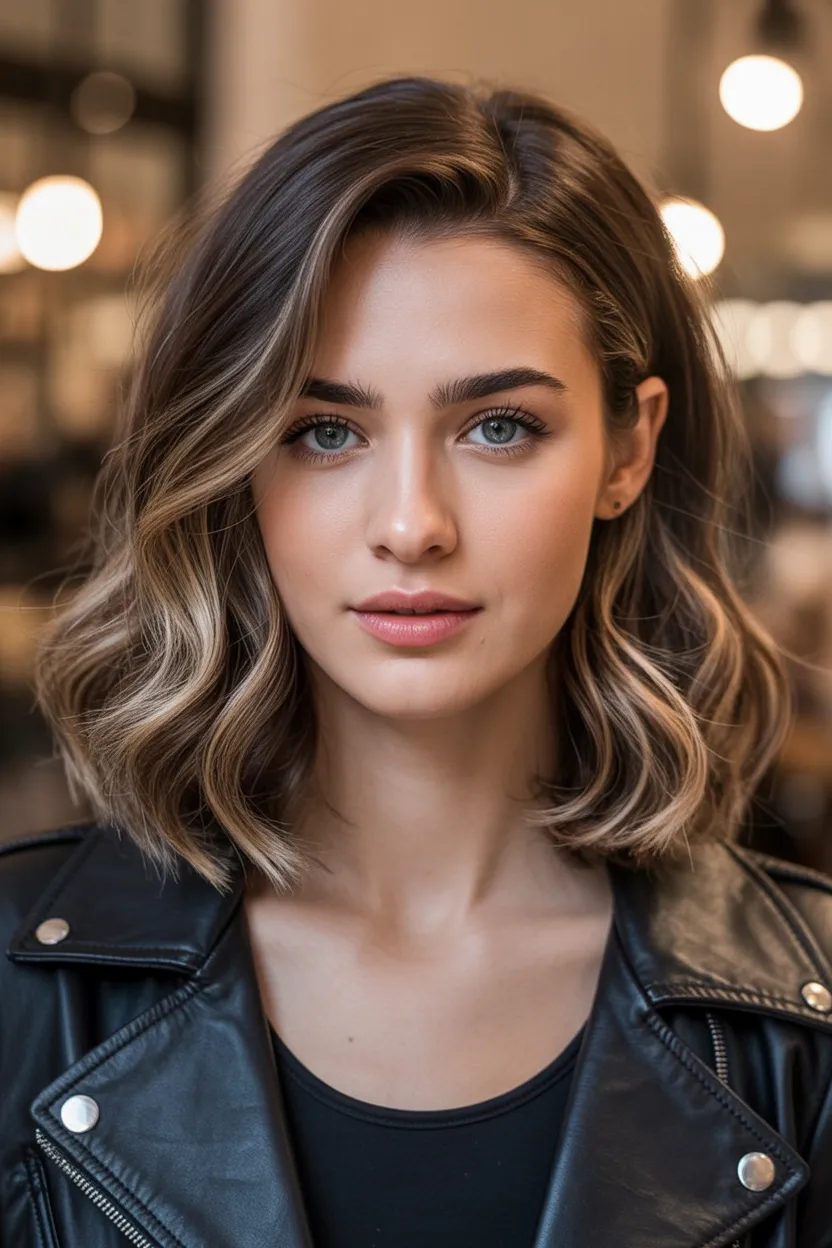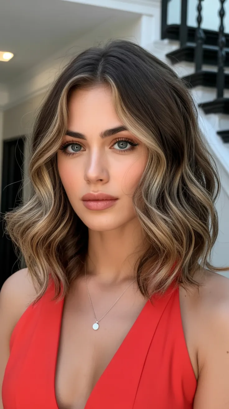 This Wavy Brunette lob has that confident, head-turning energy we secretly love. The brighter pieces around the face almost act like built-in lighting, softening features while adding a little drama. It feels modern but not trendy-for-the-sake-of-trendy—more like a woman who knows what works and isn’t afraid to glow a little. There’s movement, dimension, and just enough contrast to keep it interesting.