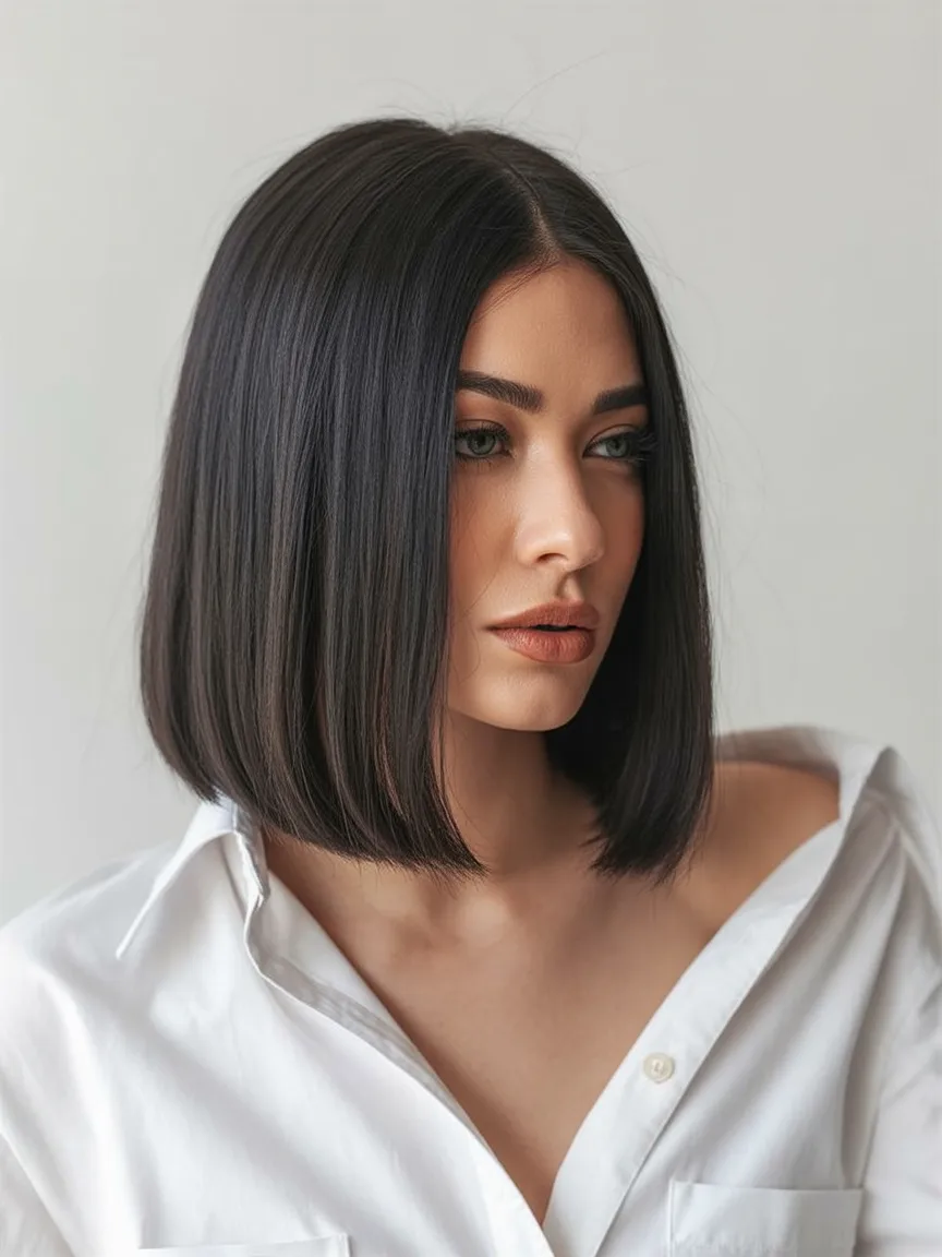 What makes this cut special is the precision. On Straight or slightly Wavy hair, the Angled shape creates structure and density, especially helpful for Fine hair. A smoothing serum and flat iron will maintain that glassy finish. Compared to a Messy or Shaggy lob, this version is all about sleek sophistication.