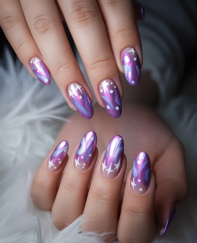 There’s something almost hypnotic about this dreamy blend of Purple and Blue melting together in a soft aura glow. It feels like a tiny galaxy wrapped around your fingertips—playful, slightly mysterious, and just bold enough to catch the light when you reach for your coffee. The subtle shimmer and delicate star accents give it that fresh spring Inspo energy, like the first warm evening after a long winter.