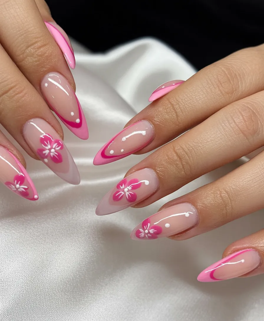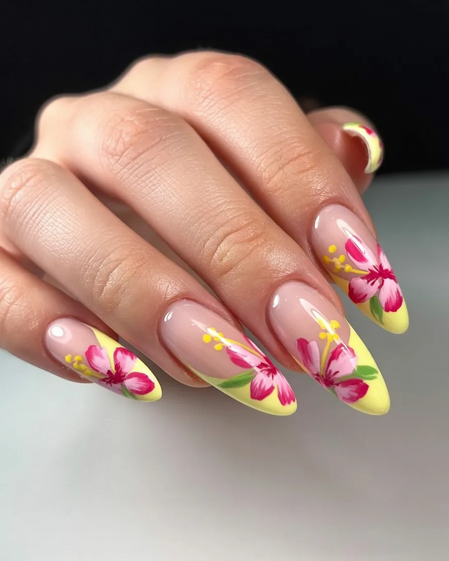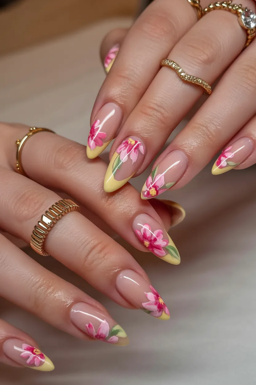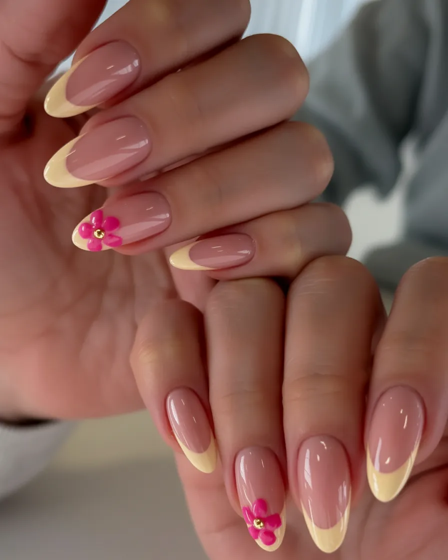 This manicure feels like a mini tropical getaway. The soft nude base melts into sunny Yellow tips, while bold Pink florals bloom across the nails in the prettiest, most uplifting way. It’s bright, cheerful, and just a little flirty—exactly the kind of spring Inspo that makes you want to book a weekend trip or at least order a fruity cocktail.