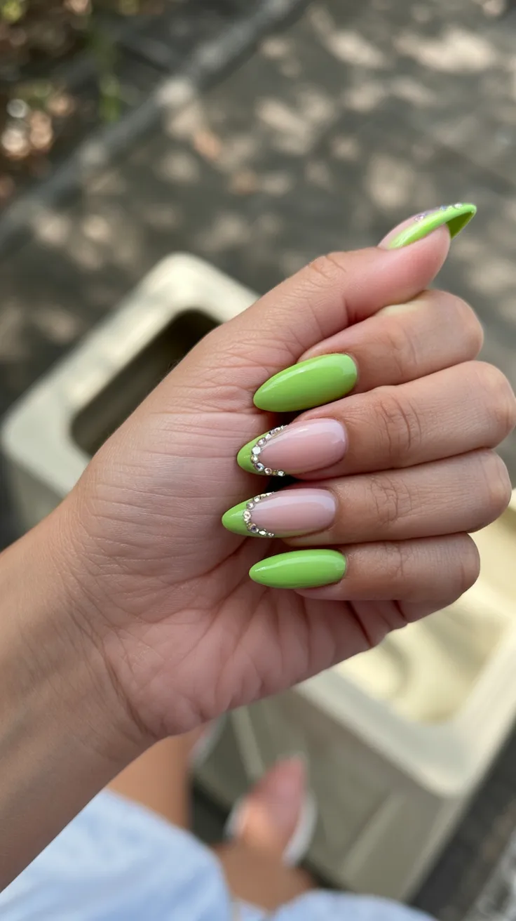 Clean, modern, and just a touch glam—this Green French moment is for the woman who loves Simple elegance but still wants a little shine. The delicate rhinestone curve adds just enough sparkle to feel special without shouting for attention. It’s refined, but not boring.