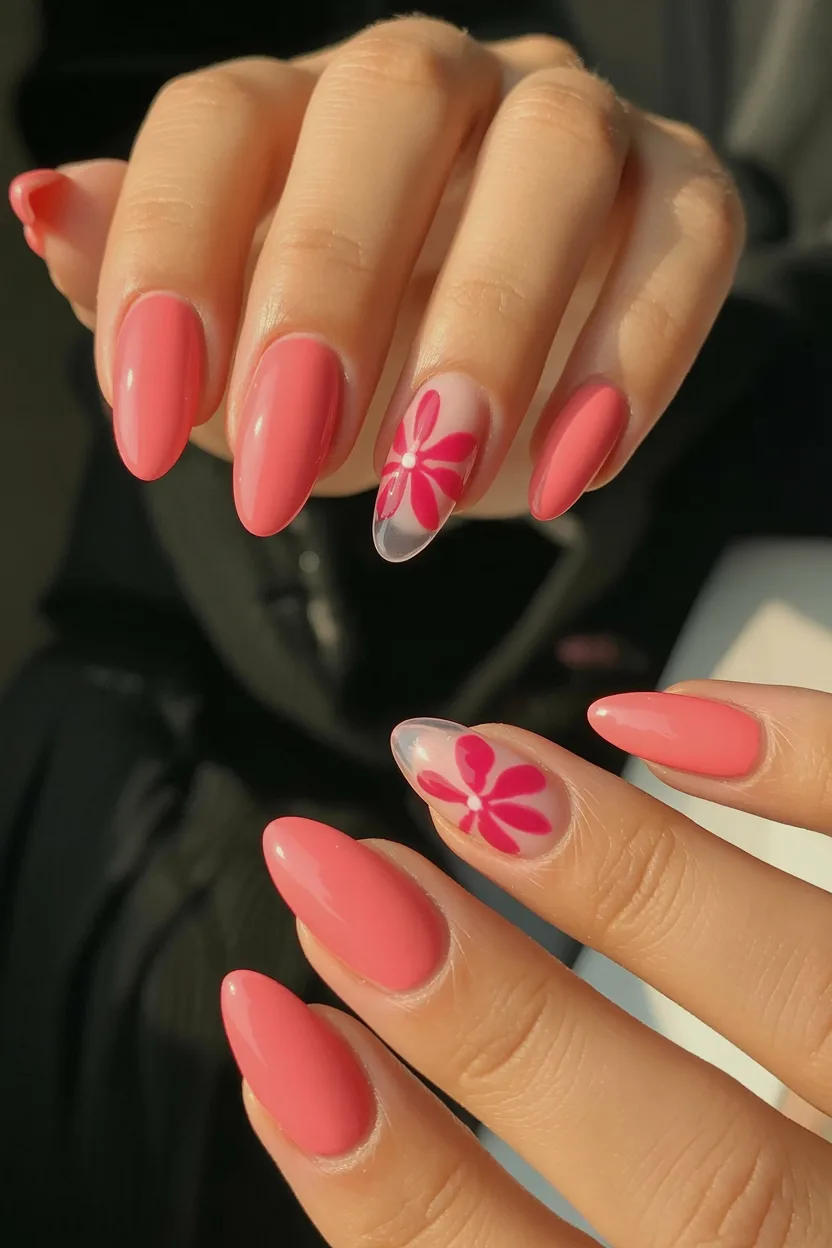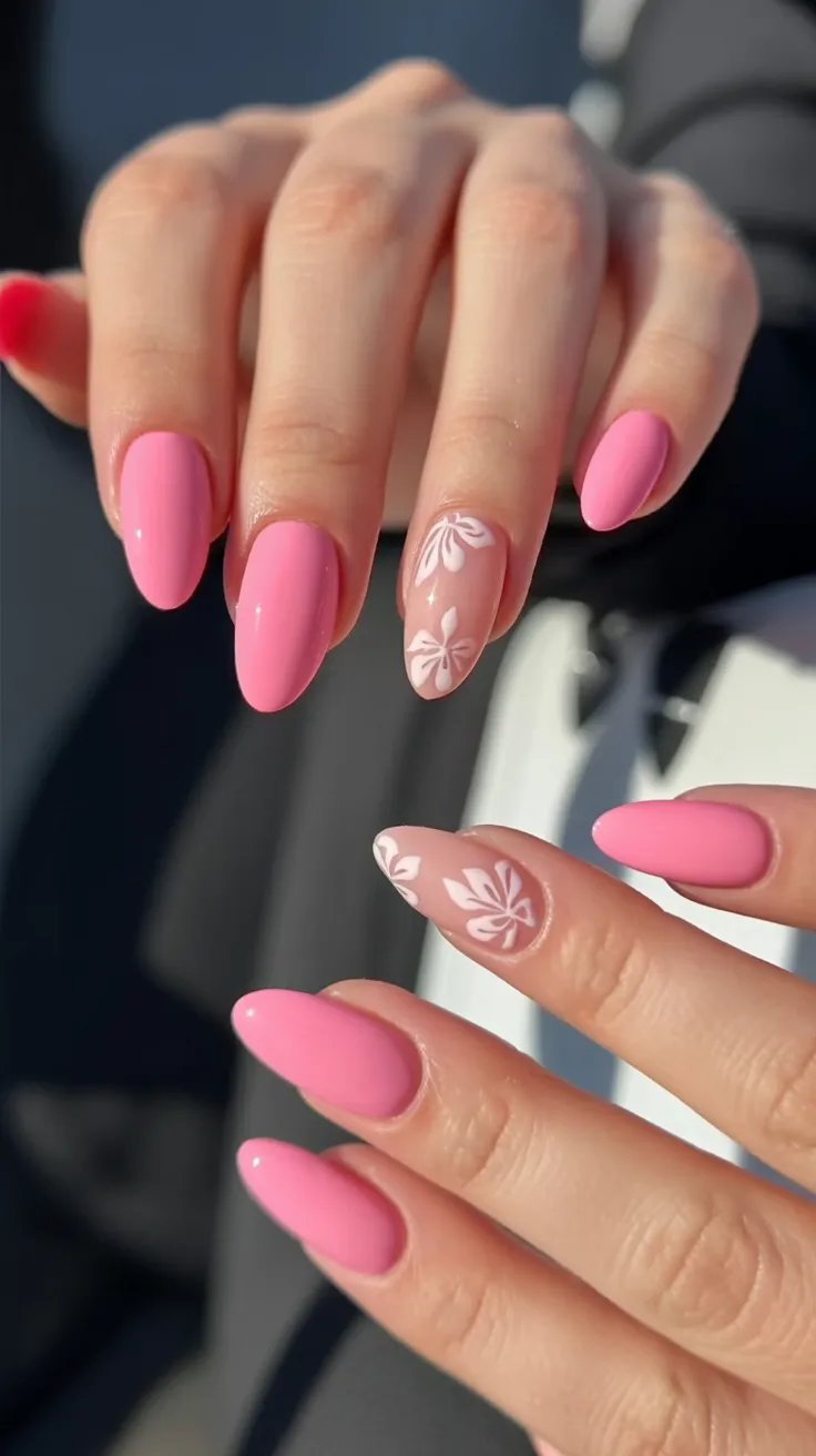 A solid pink manicure is an absolute classic—it is ageless and looks great with any outfit. The addition of an accent nail with sheer floral designs and a soft pink to a solid pink manicure makes it more playful and perfect for spring.