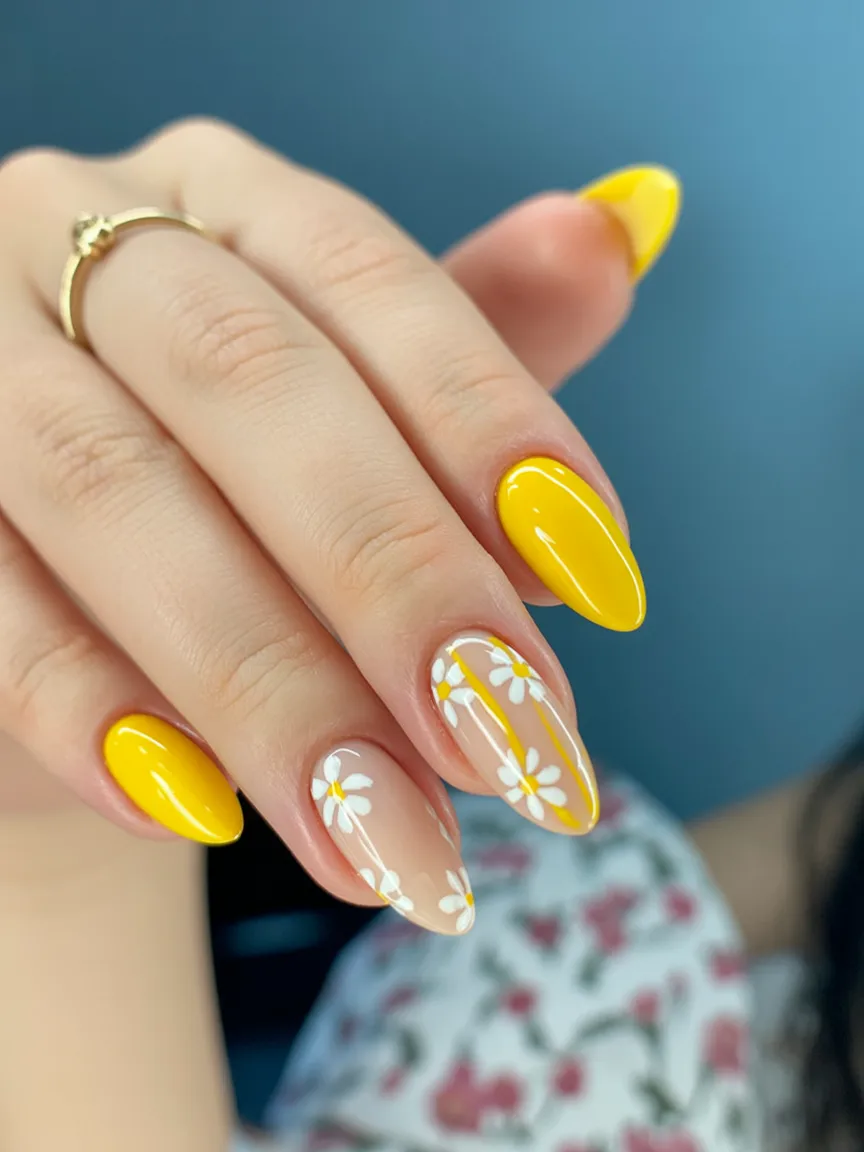 Bright Yellow nails just have a way of making everything feel lighter. Combined with delicate daisy accents over a sheer base, this look captures that carefree, warm-weather happiness we all wait for. It’s cheerful without being loud, and honestly—it’s hard not to smile when you see it.