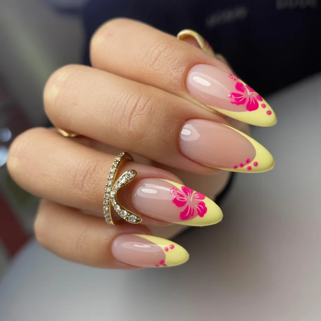 For anyone who usually sticks to Simple manicures, this is a gentle way to experiment with color. The Almond shape keeps it soft and flattering, while the floral Design adds a playful touch. It’s one of those Ideas that feels perfect for vacations, weekend brunch, or anytime you need a little sunshine at your fingertips.