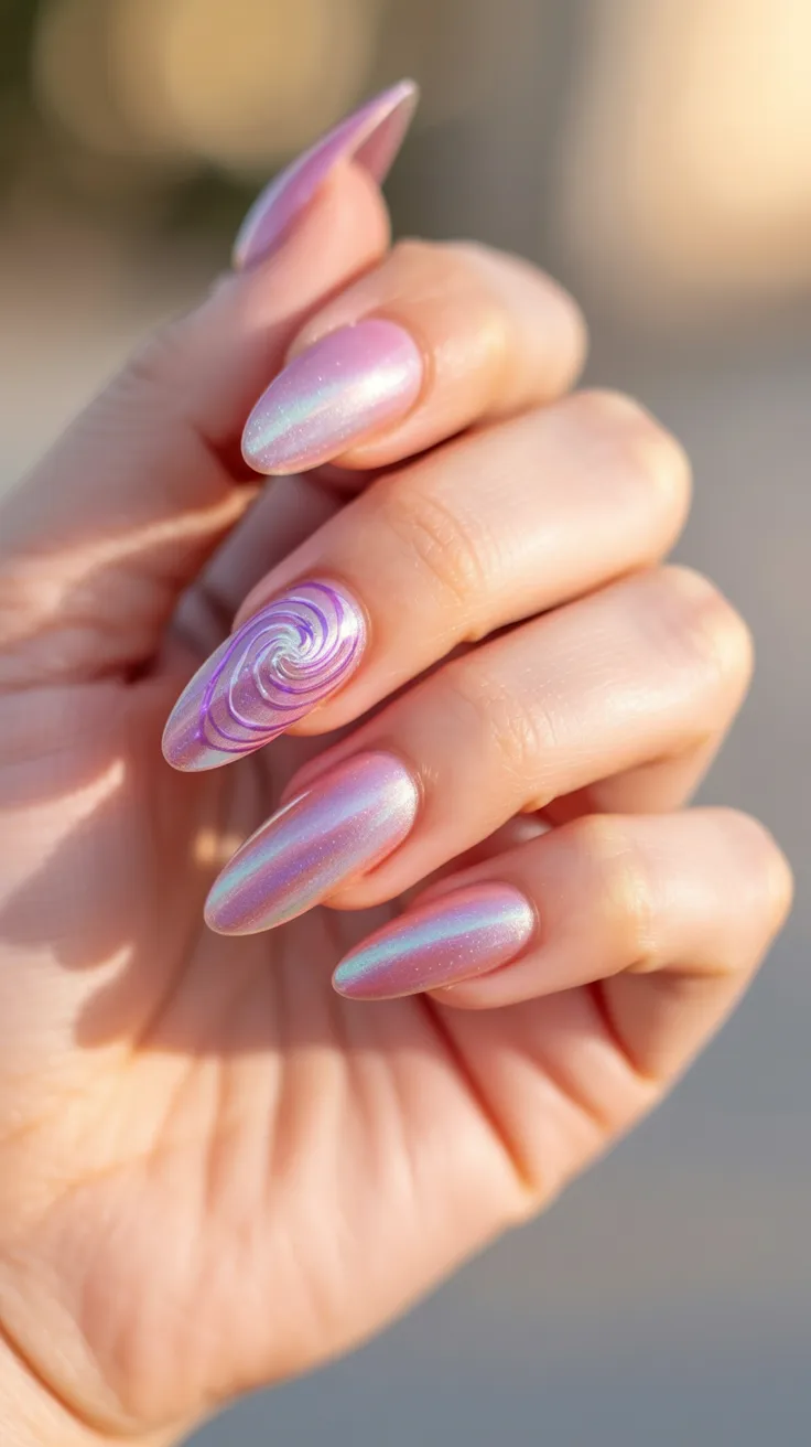 This one feels like mermaid magic for grown women. The soft Purple base with a luminous chrome finish catches the light in the most flattering way, while the subtle swirl detail adds a hypnotic, almost meditative vibe. It’s artistic but still airy enough for spring.