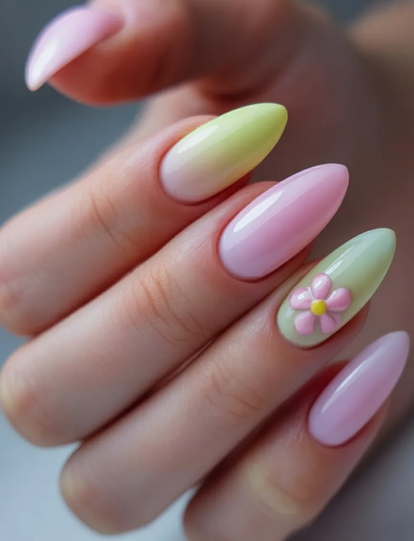 Pastel Green and soft Pink together just scream spring. The gentle gradient mixed with a tiny floral accent gives this manicure a sweet, optimistic vibe. It feels light, playful, and completely wearable—like your favorite cozy sweater but in nail form.
