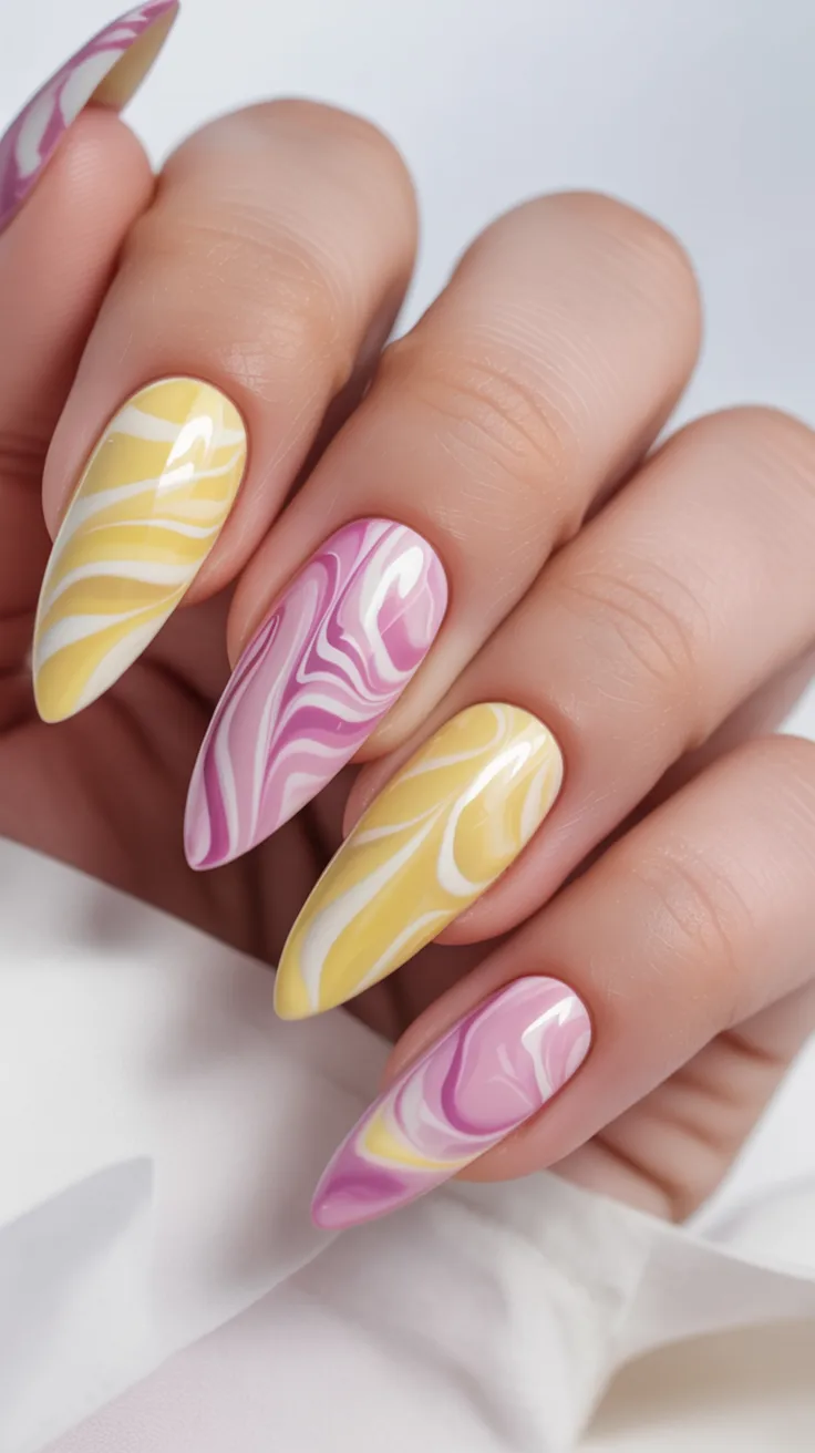 These swirling pink and yellow patterns look like melted sorbet. Plus, the fluid aura effect on every finger gives a touch of depth and movement, almost like a little abstract painting on every single nail. It’s playful and bold, and we know it’s really hard to keep a straight face when you look at it.