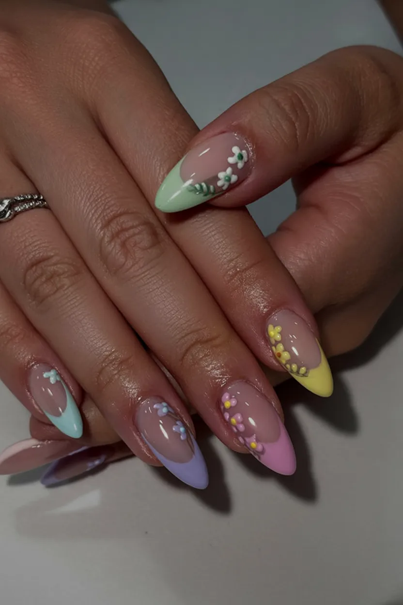 This is spring in full bloom. A mix of Pink French tips and delicate pastel florals in Blue and Yellow creates a cheerful garden-party vibe that’s impossible to ignore. It’s bright but still soft, playful yet polished—the kind of manicure that turns heads in the best way.