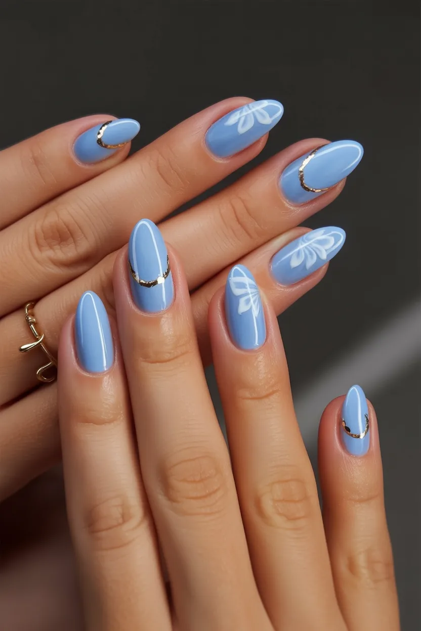 Soft Blue nails have such a calming, polished feel. Add a delicate floral detail and a thin metallic curve, and suddenly you have something that feels both modern and timeless. It’s clean, graceful, and effortlessly stylish.