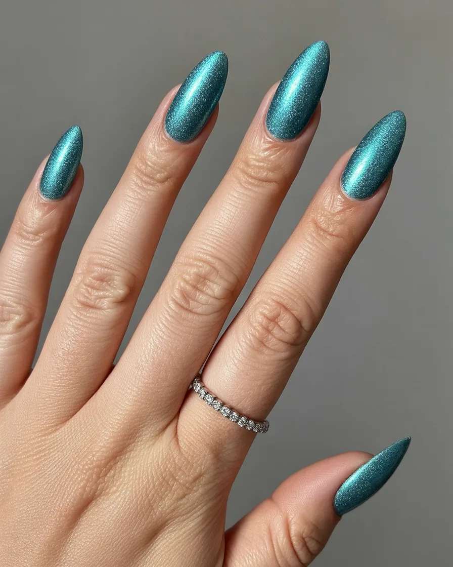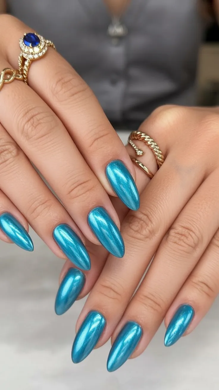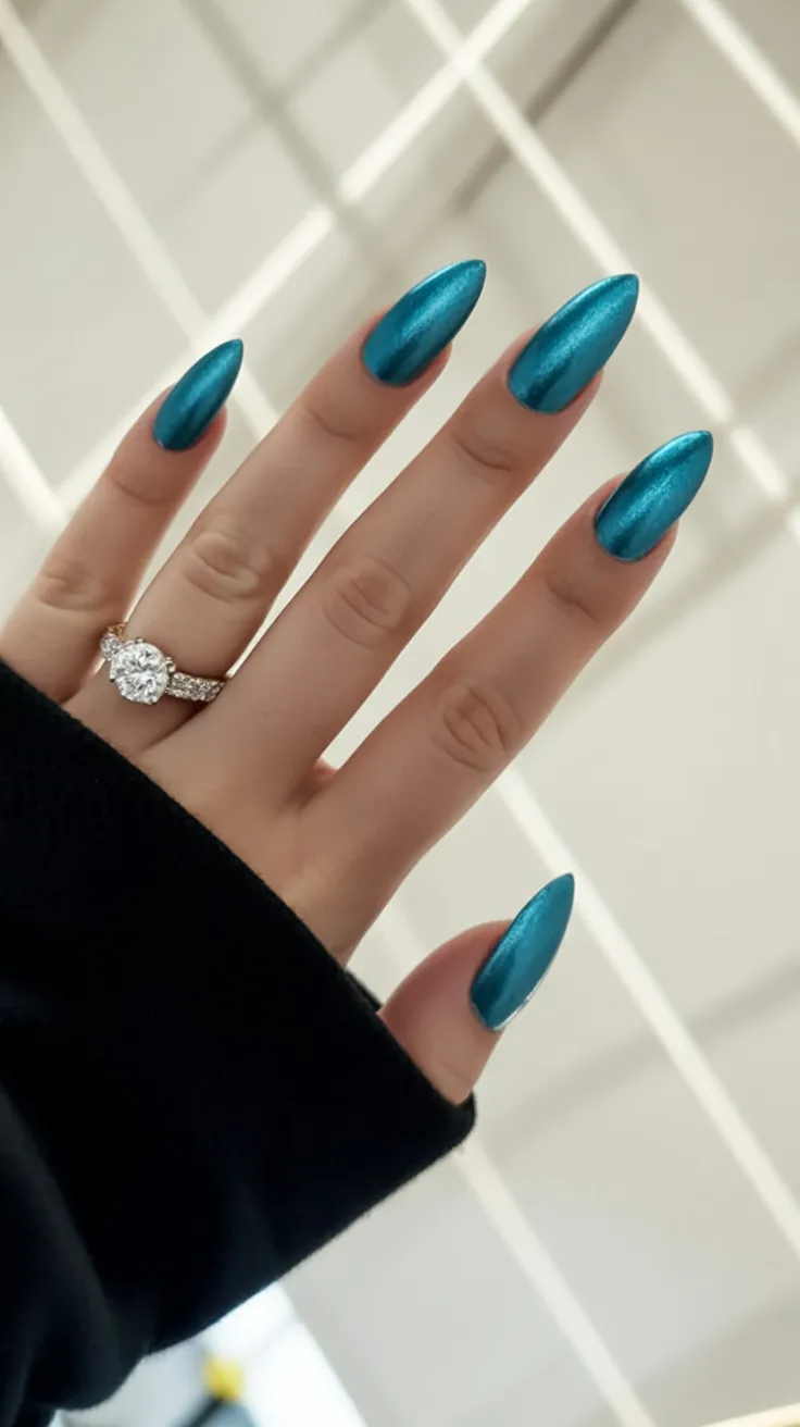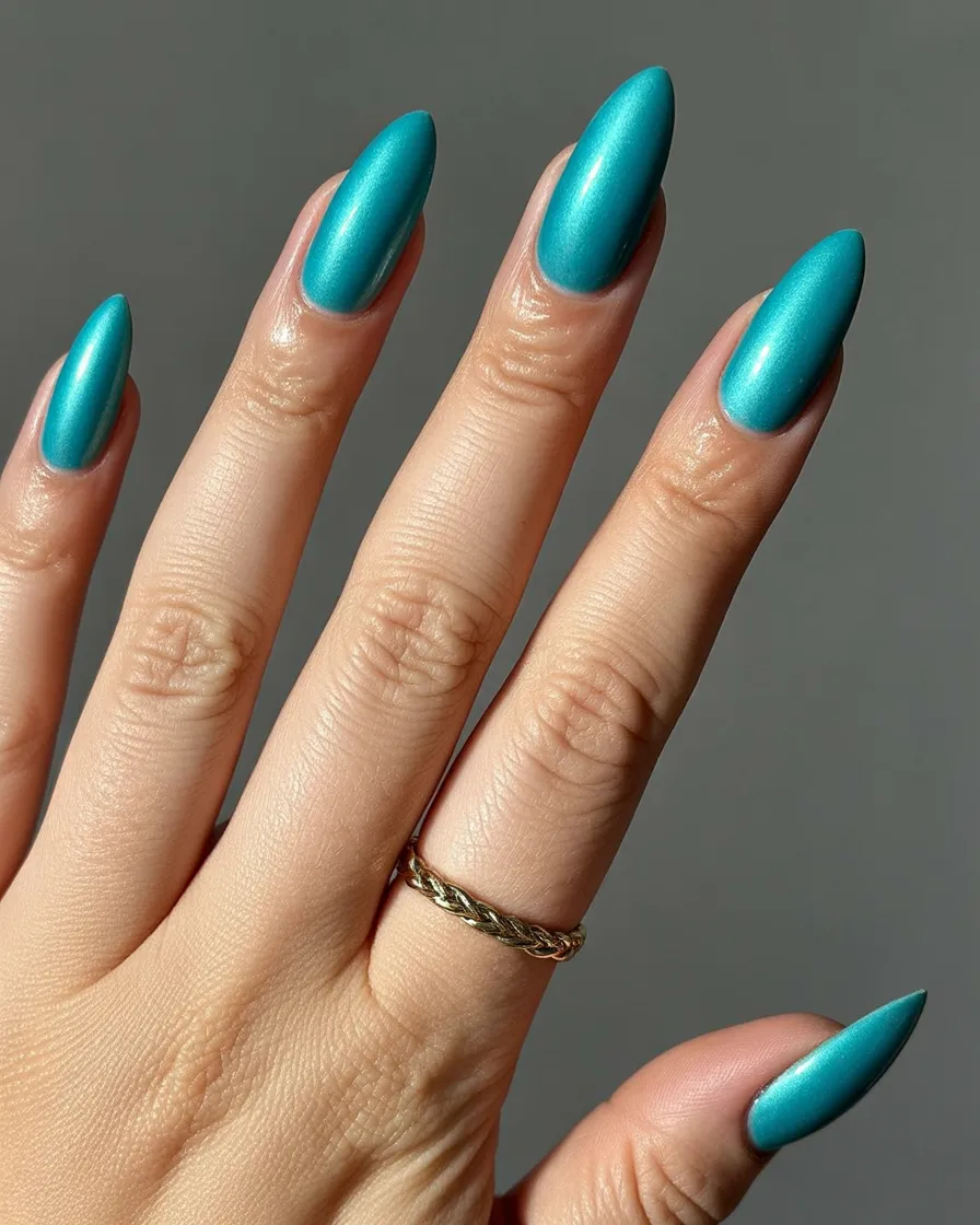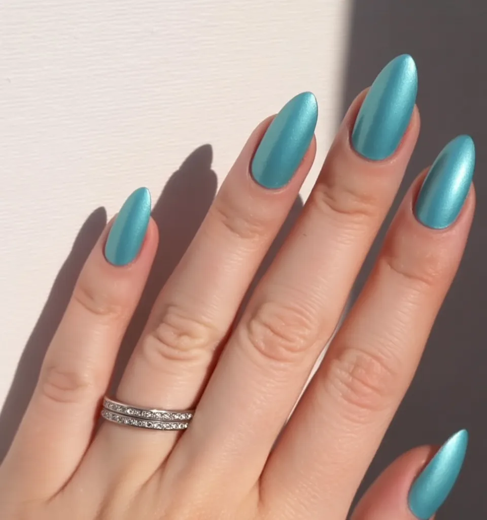 This version of teal feels luxurious and bold, almost like satin fabric under bright light. The high-gloss finish gives the nails a sculpted, editorial feel that instantly elevates your hands. It’s dramatic in the best way, yet still incredibly wearable for everyday life.