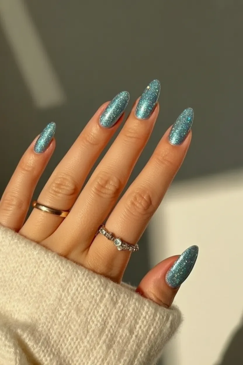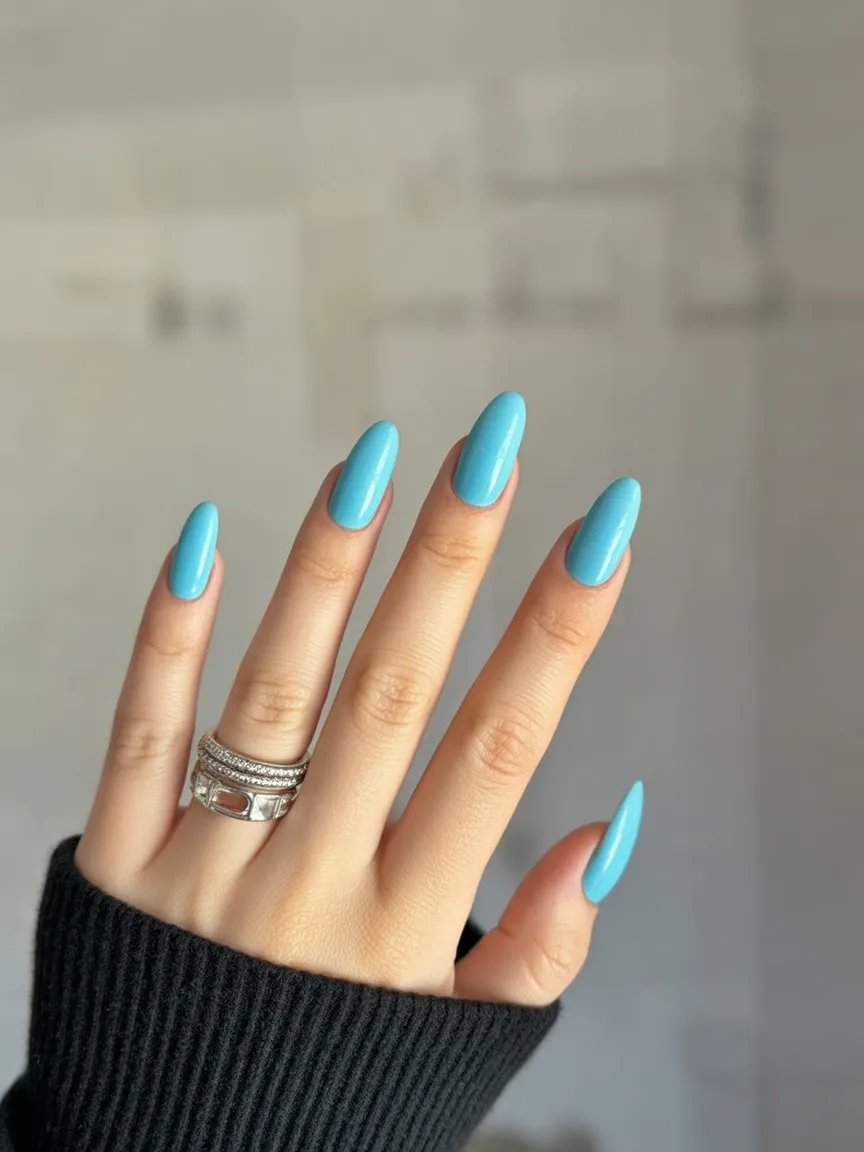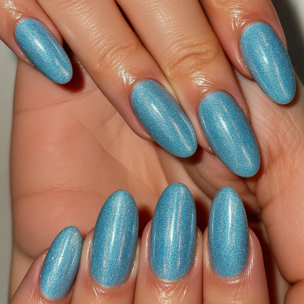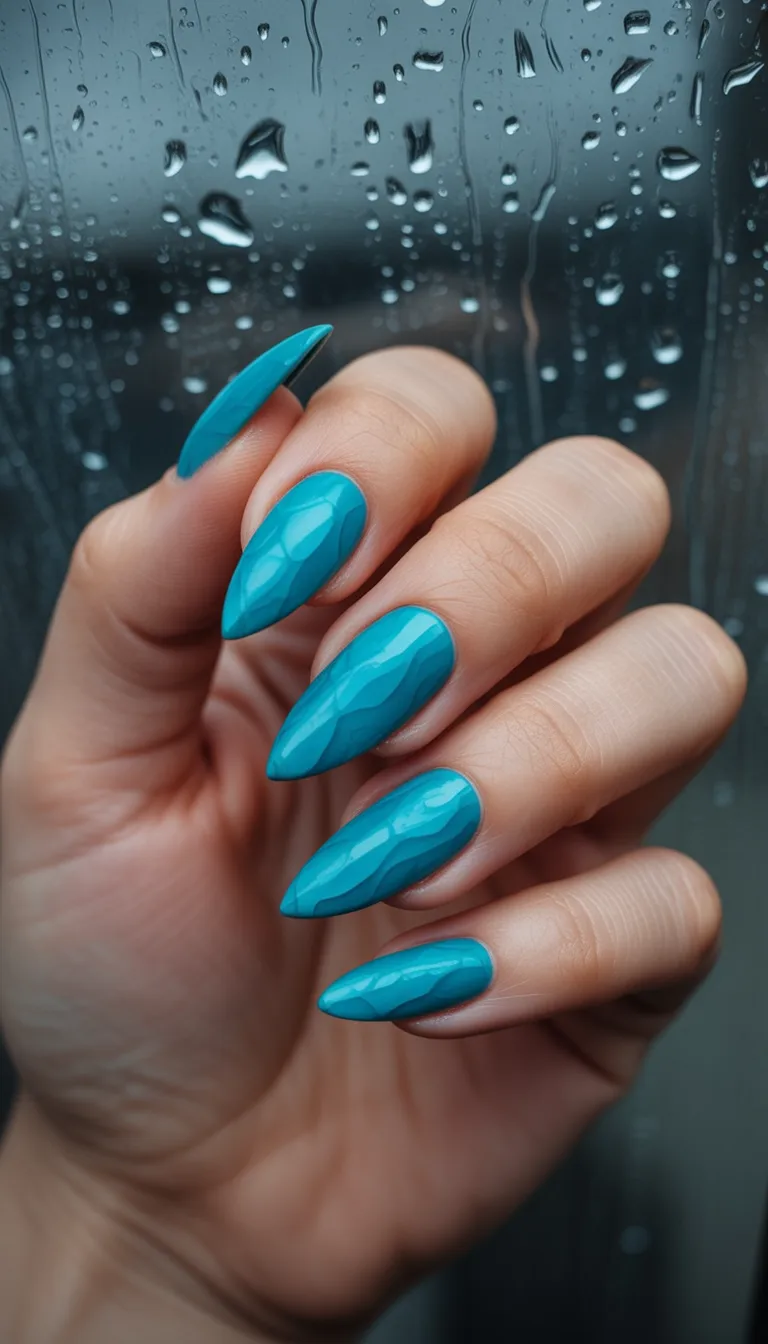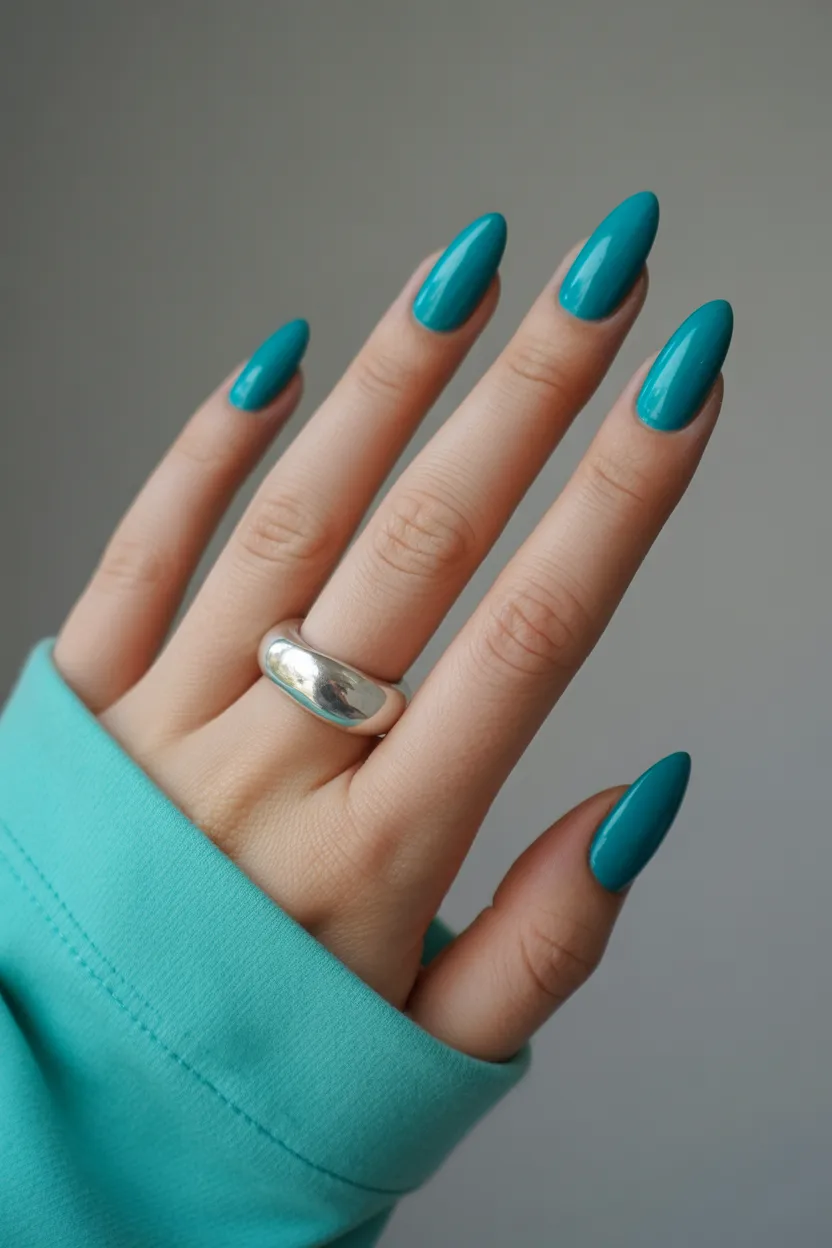 This version of teal feels luxurious and bold, almost like satin fabric under bright light. The high-gloss finish gives the nails a sculpted, editorial feel that instantly elevates your hands. It’s dramatic in the best way, yet still incredibly wearable for everyday life.