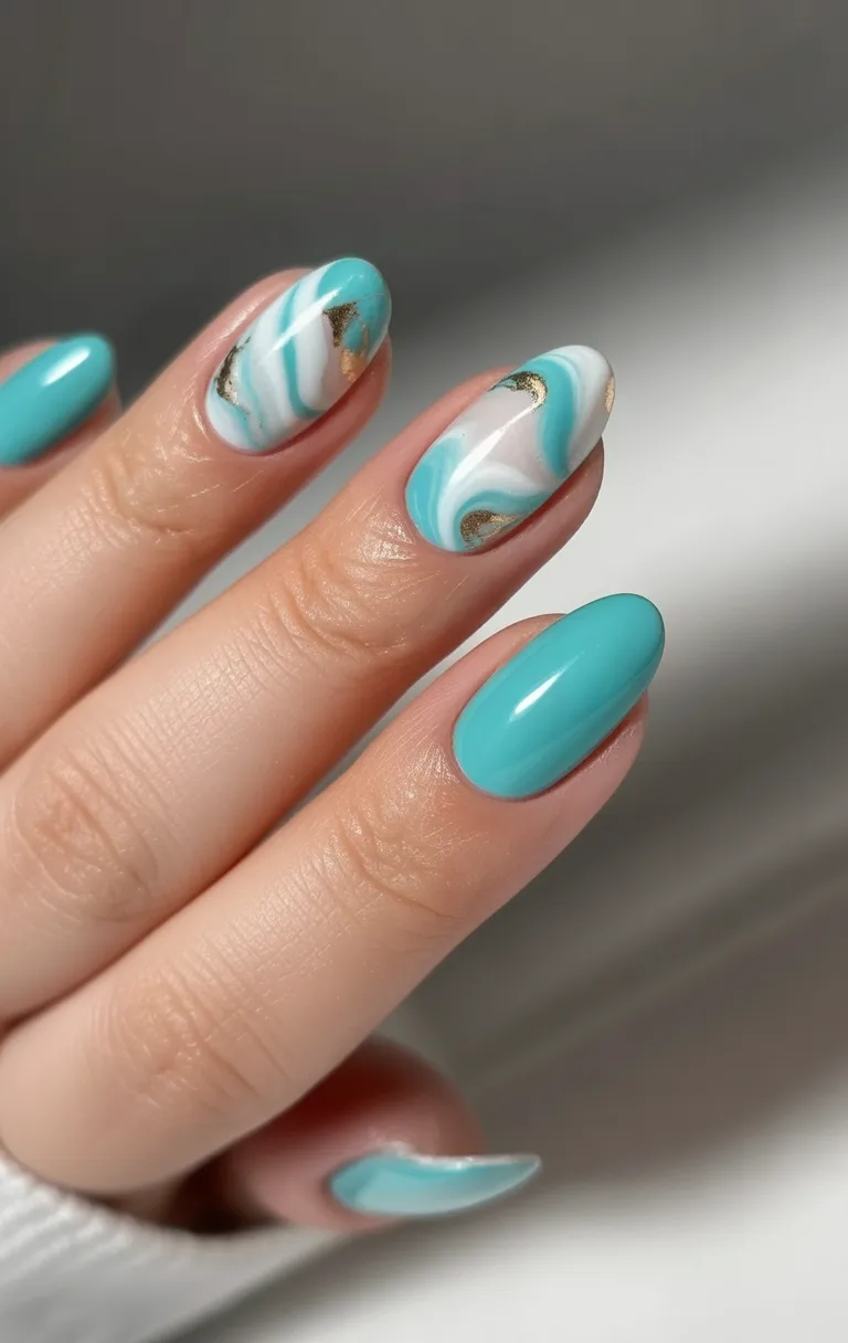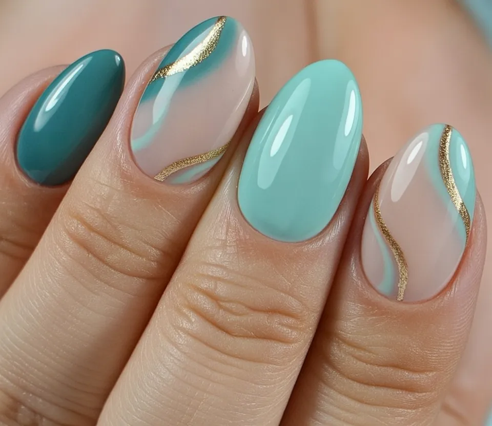 If you’ve been bored with solid colors, this is your sign to try nail Art again. The design still feels balanced thanks to the solid teal nails alongside the patterned ones. It’s a beautiful example of how Designs can feel elegant and wearable, especially when paired with simple outfits and minimal jewelry.