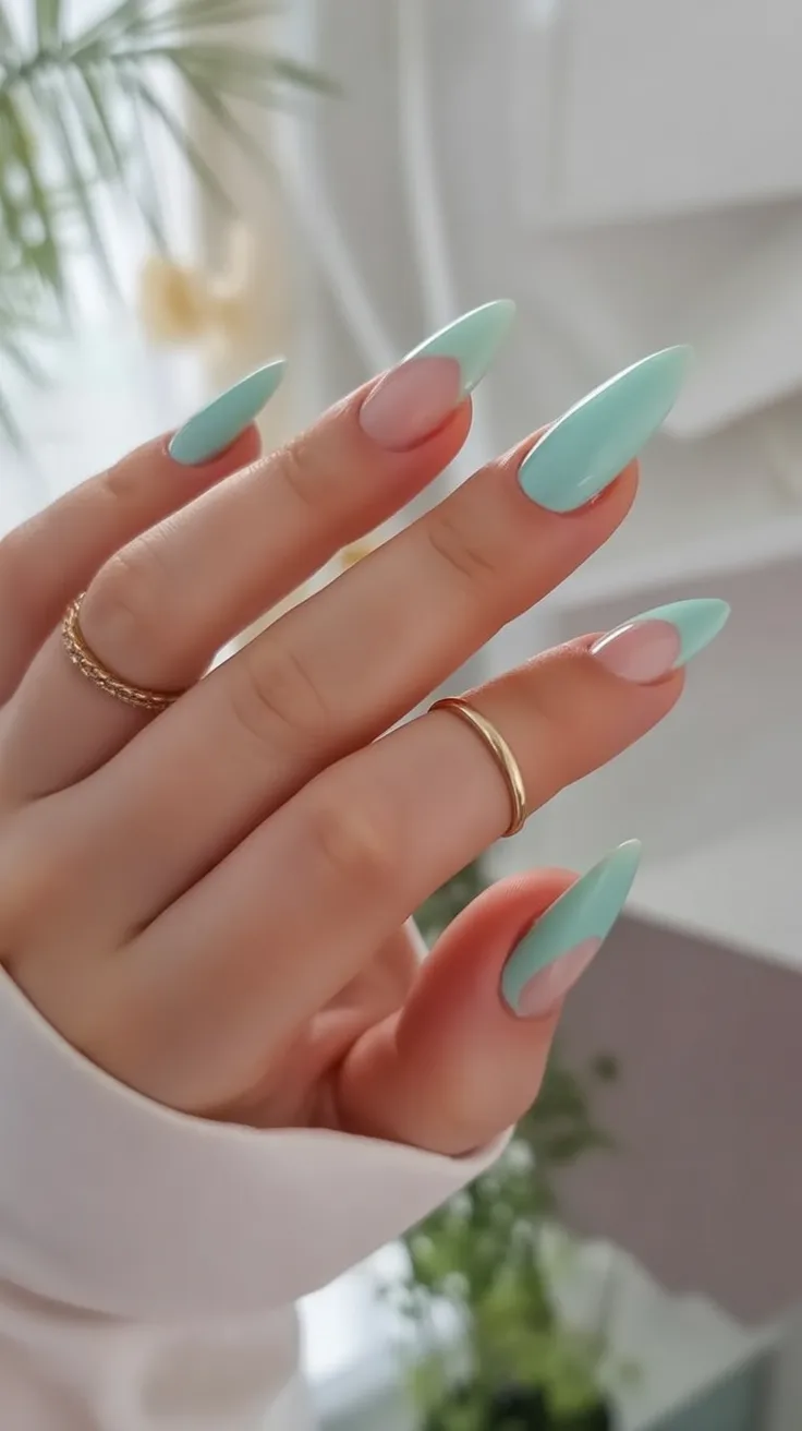 Light, airy, and very springtime. sober soft teal tips over a natural base add a fresh update to classic French, making it feel younger and more playful without losing its elegance. It’s feminine, flattering, and quietly stylish.