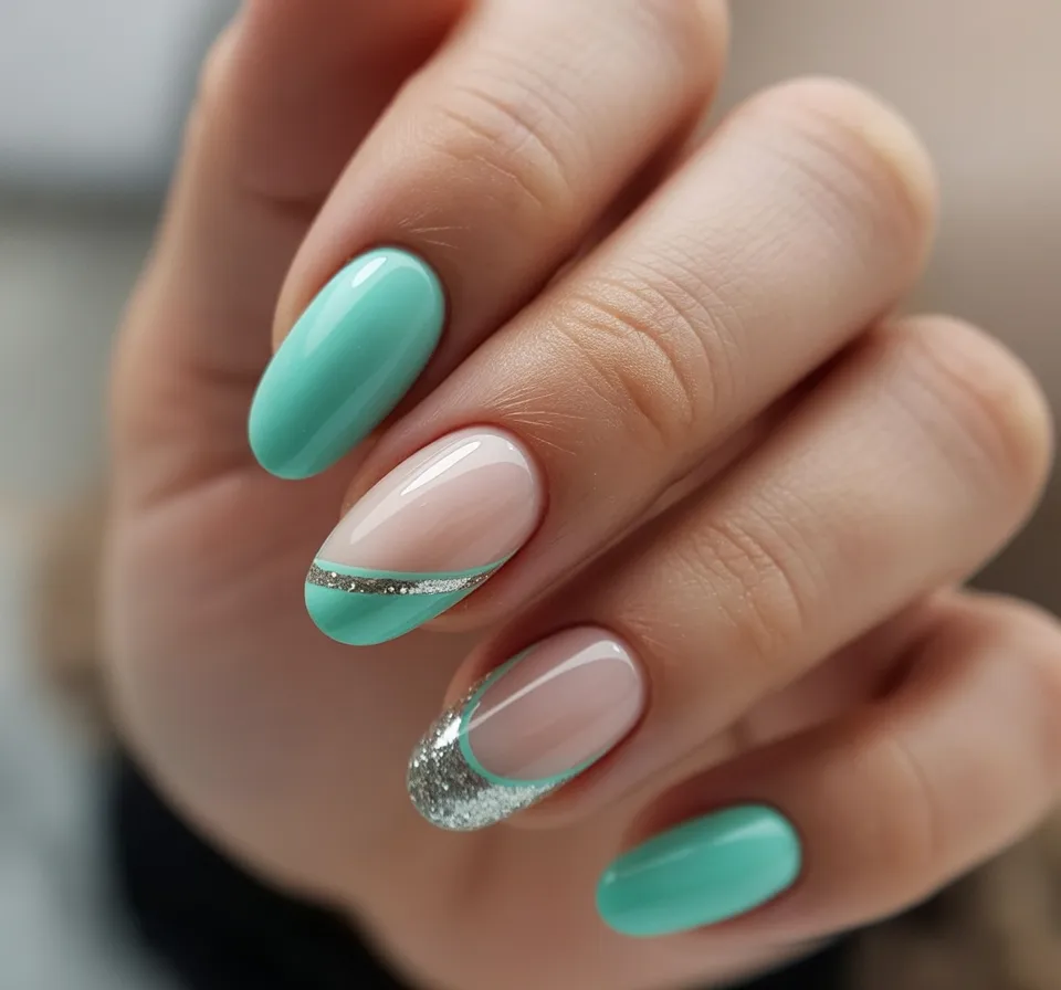 This manicure feels like a breath of fresh spring air. The soft teal paired with a natural base looks clean, feminine, and effortlessly polished. The thin silver curve adds just enough shine to catch attention without overpowering the look. It’s refined, graceful, and perfect for women who love Designs that feel elegant but not fussy.