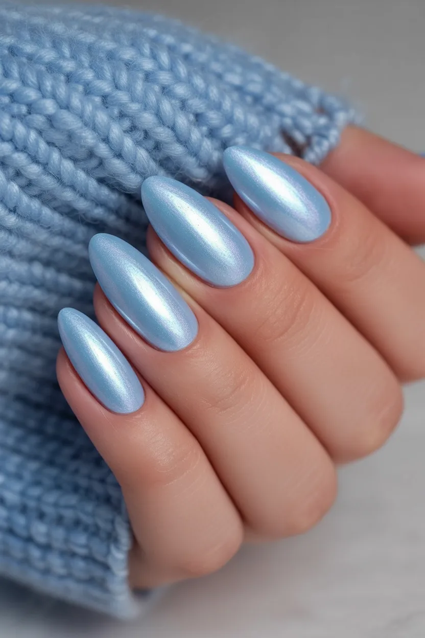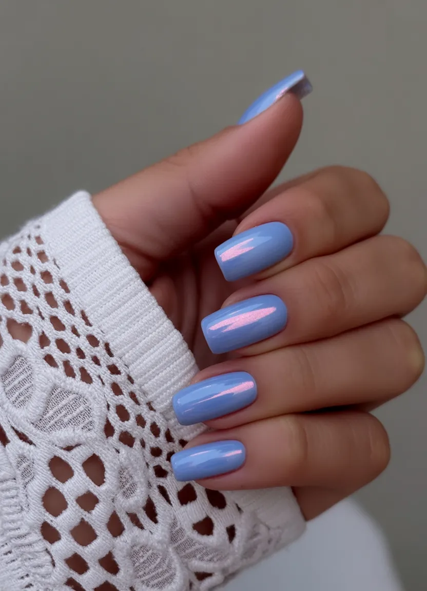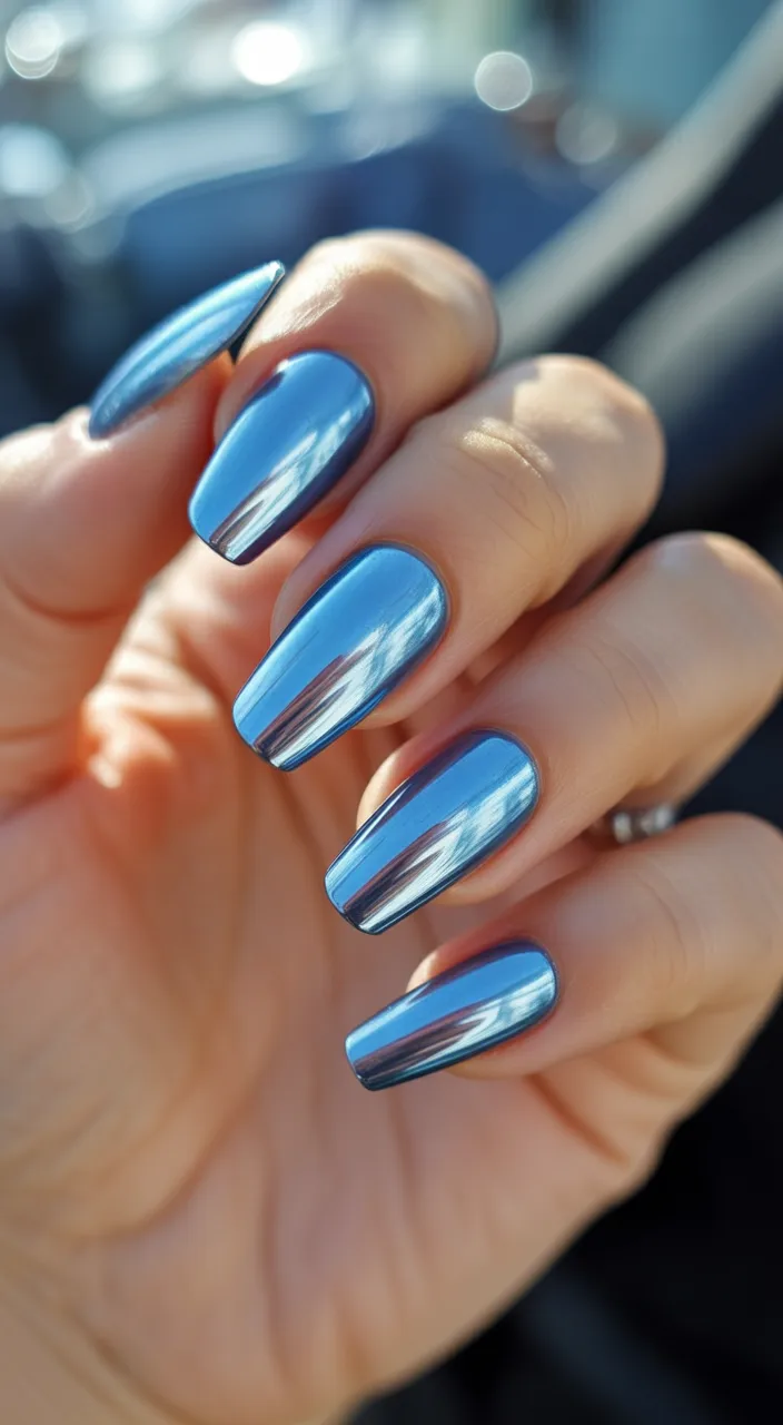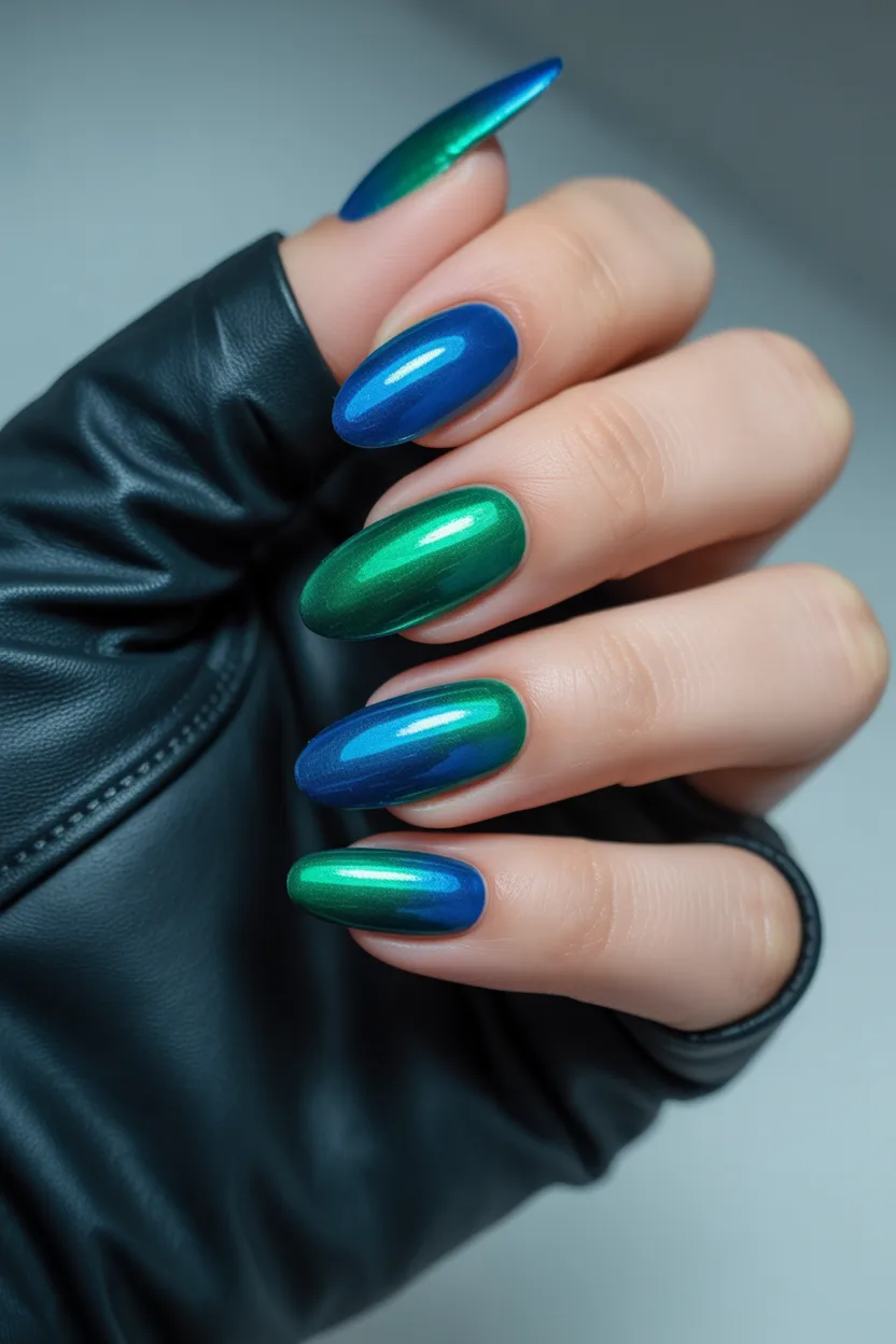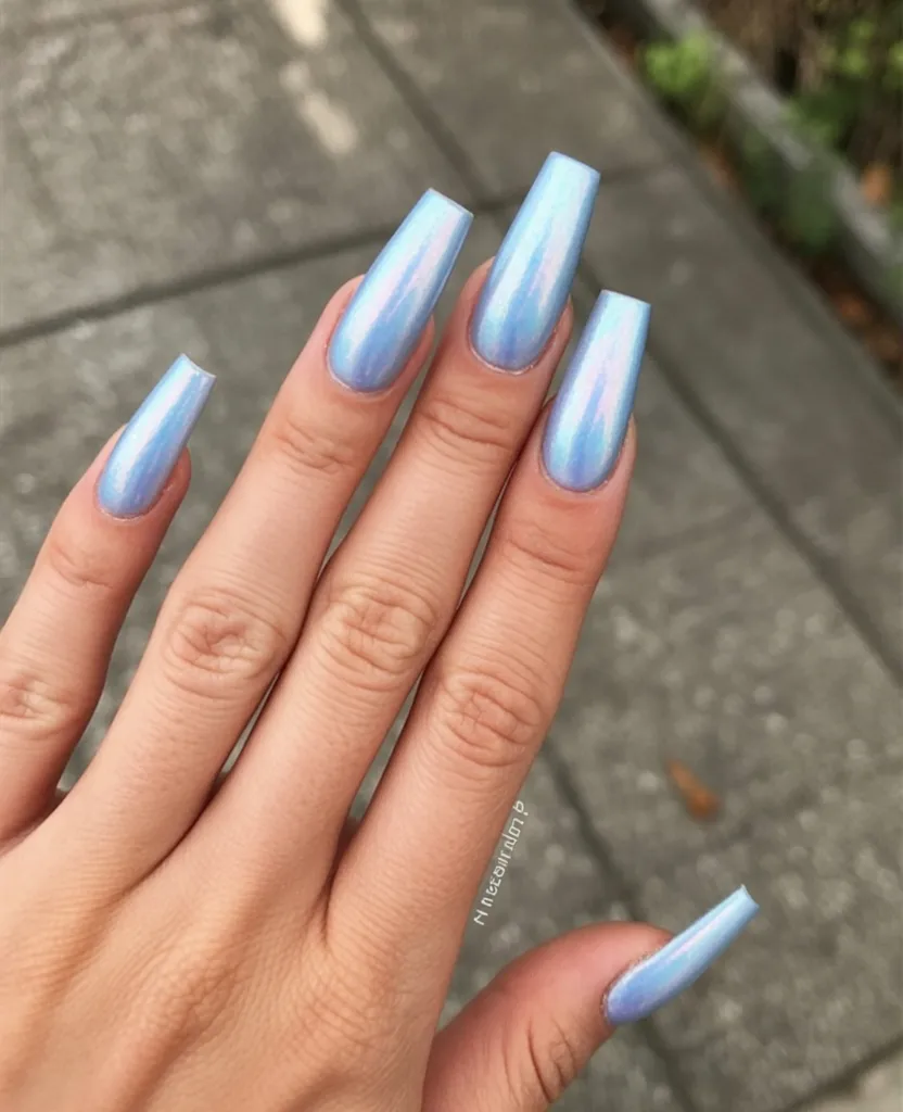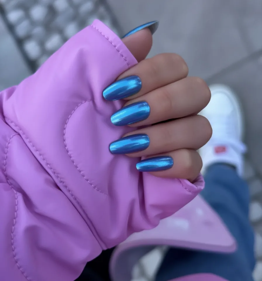 Fashions come and go, and this manicure has an avant-garde attitude. It’s an effect of a shift of Blue and Green with a strong and daring chrome effect. It’s perfect for those women who like cool, modern, and glossy nails. Compared to softer finishes, this look is all about impact. A high-shine surface does all the work, and no extra designs or details are required. It’s a great option if you love the dramatic play of colors but you like it to be very clean and polished.