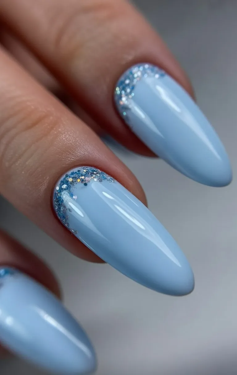 This style works best if you are a light color lover but are trying to avoid anything flat or boring. The light sparkle creates dimension without becoming over the top, making it perfect for everyday wear. It works really great for almond shapes and spring “looks.” Clean, modern, and quietly elegant.