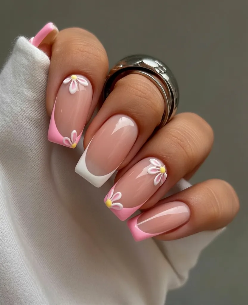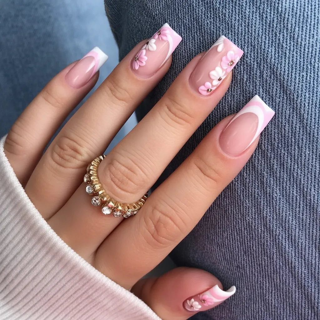 11. Pink French Square Nails with Floral Details