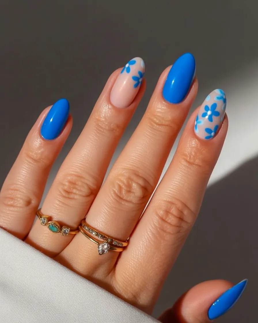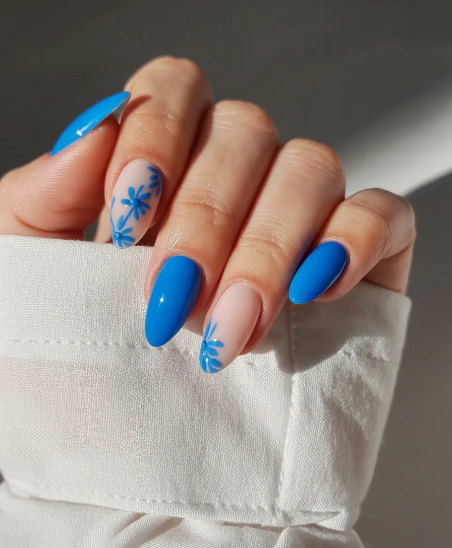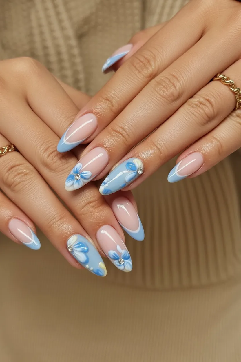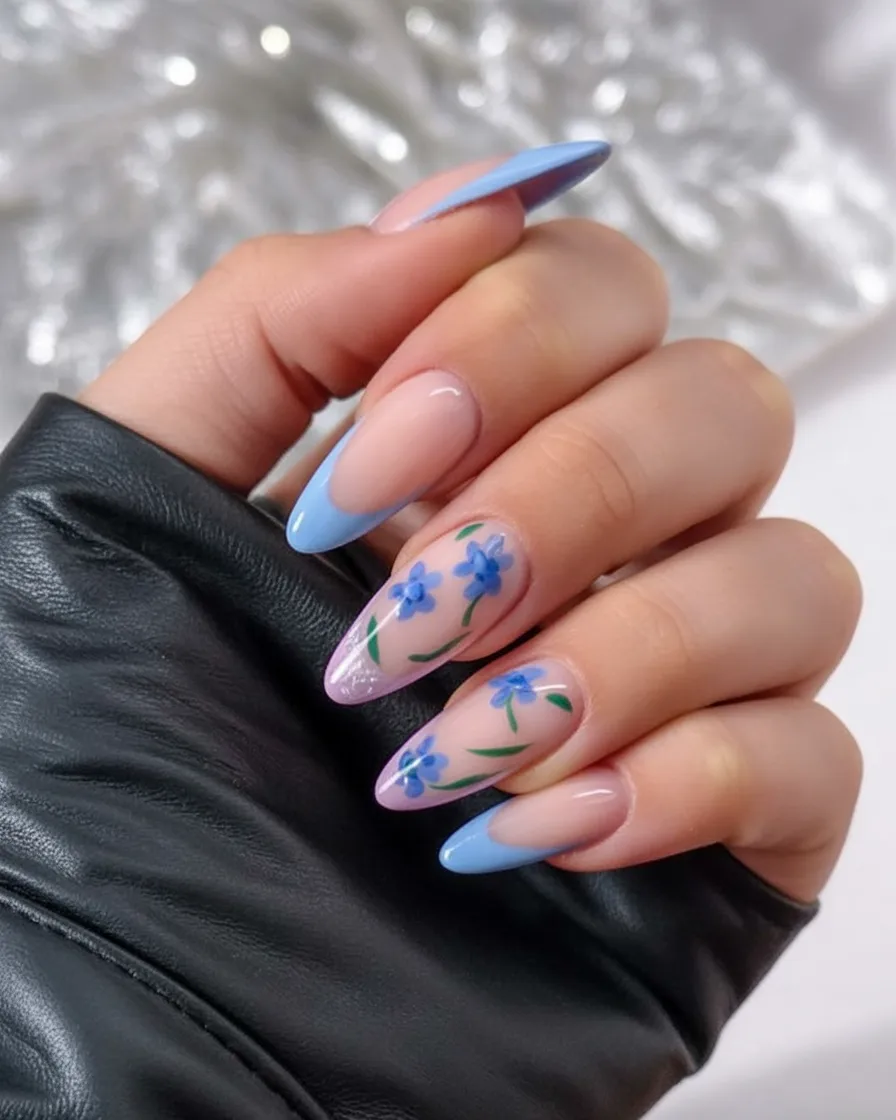 10. Blue Floral Almond Spring Nails