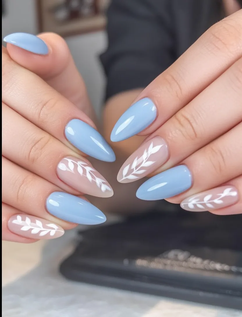 5. Light Blue Botanical Almond Nails