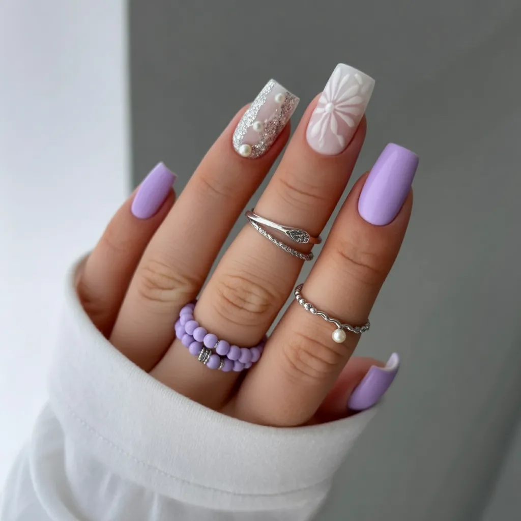 8. Lilac Square Nails with Pearl Accents