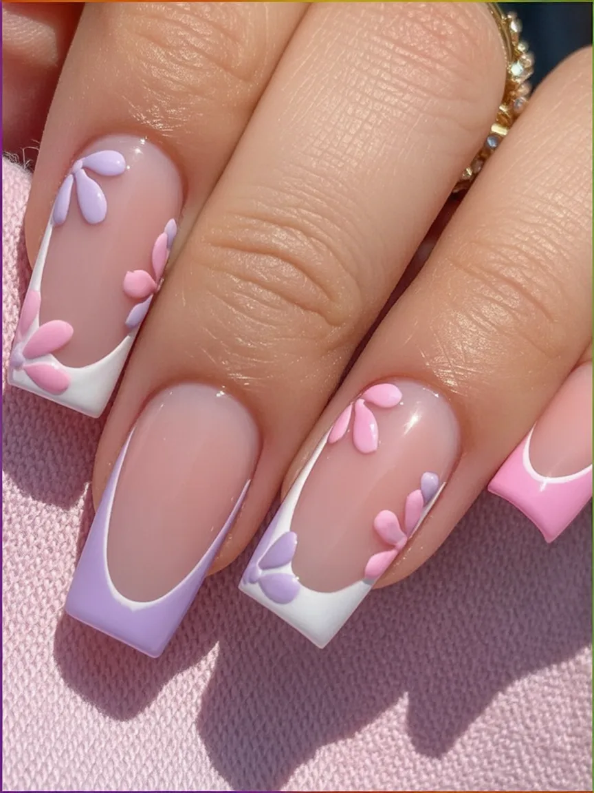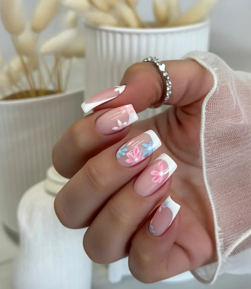 24. Pastel French Square Nails with Floral Art