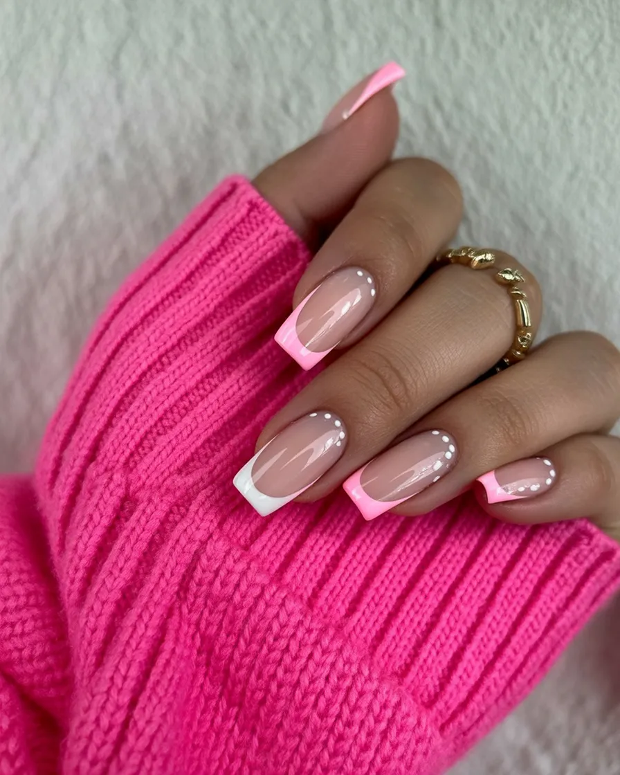 16. Pink French Square Nails with Dotted Detail