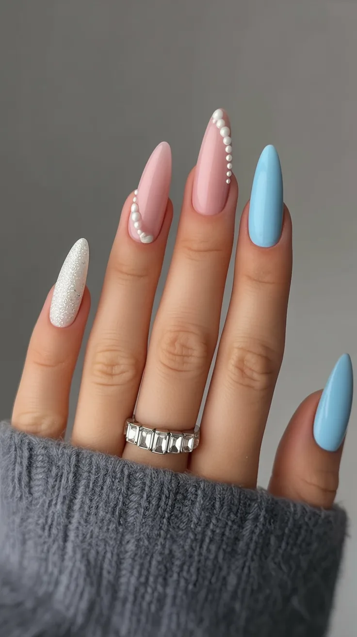 20. Pink and Blue Pearl Almond Birthday Nails