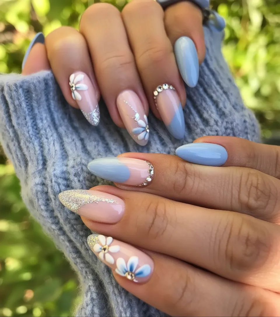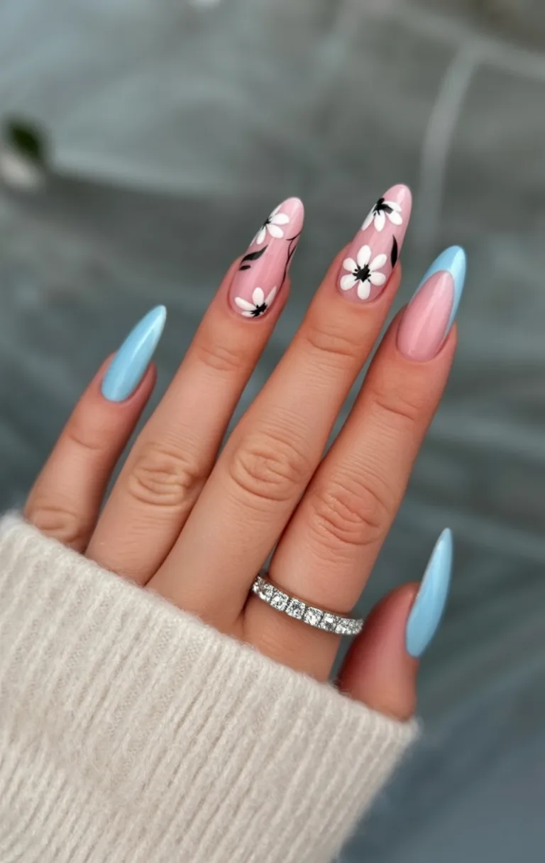 7. Pastel Blue and Pink Floral Almond Nails