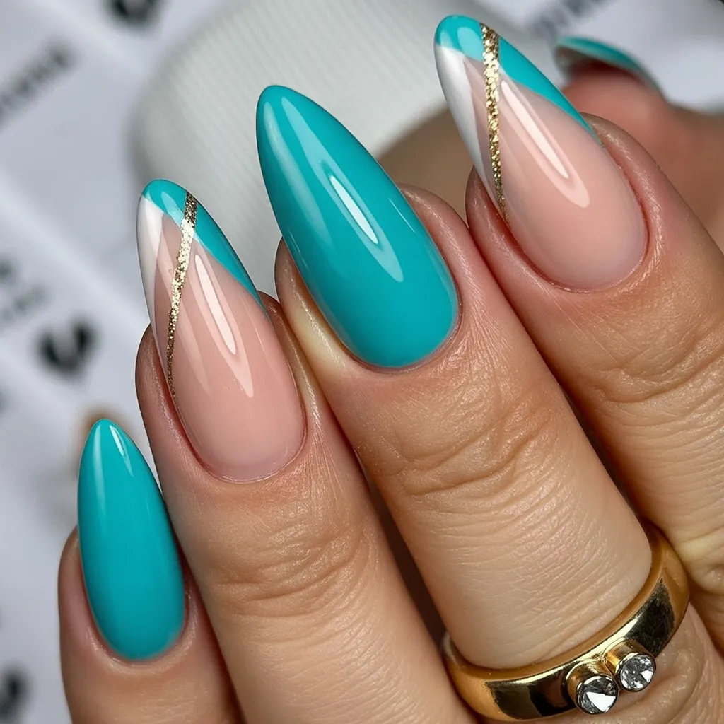 17. Turquoise Almond Birthday Nails with Gold Lines