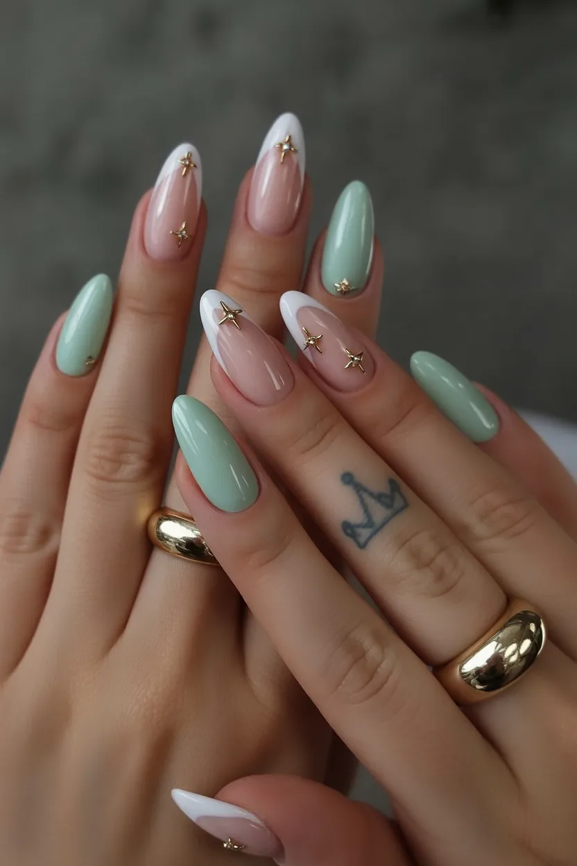 19. Mint and Nude French Almond Nails with Gold Stars