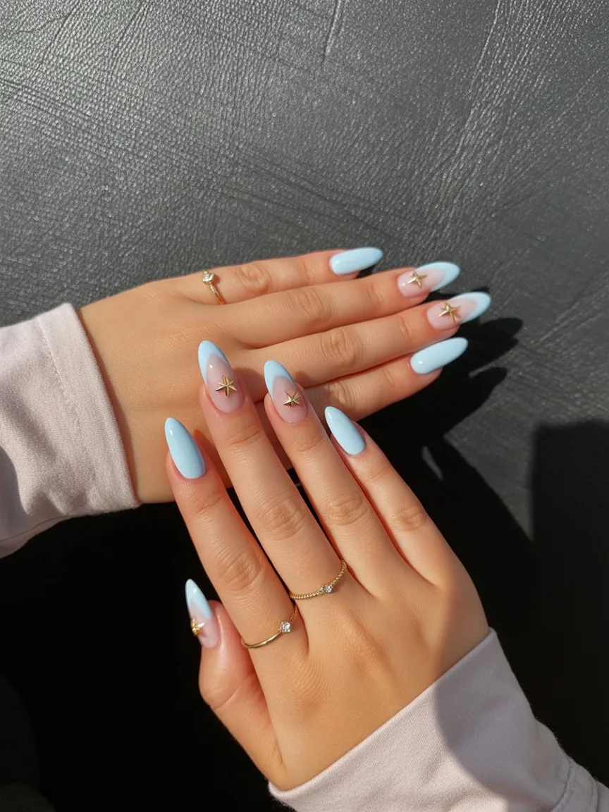 21. Baby Blue Almond Nails with Star Accents