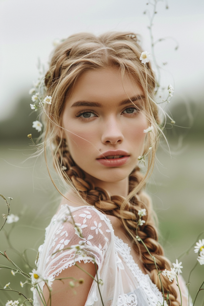 This dreamy boho knotless braid style is the definition of effortless beauty. Two thick, neatly plaited braids drape over the shoulders while wispy, face-framing strands bring a soft and romantic touch. The loose, natural texture blends seamlessly with the tiny wildflowers woven into the braids, making it the perfect look for an outdoor wedding, a music festival, or just a day when you want to feel like a woodland goddess. The best part? The knotless technique keeps everything light and comfortable, so you can wear it all day without tension headaches
