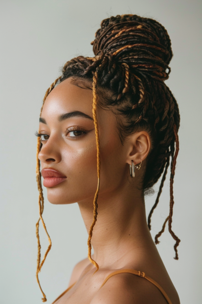 What makes this look so special is its mix of structure and flow. The low bun adds a touch of sophistication, but the free-flowing braids keep it playful and relaxed. And those warm-toned highlights? Absolute perfection for adding depth and vibrancy. It’s the kind of hairstyle that feels unique and personal while still being effortlessly wearable.