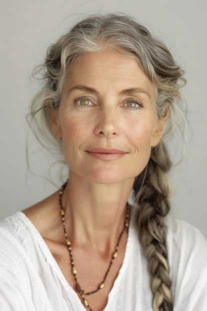 What I love about this look is how it radiates grace without trying too hard. The loose braid gives it a touch of effortless charm, while the natural silver tones make it even more unique. It’s the kind of hairstyle that feels authentic, easy, and undeniably beautiful—like a reflection of confidence that only grows stronger with time.