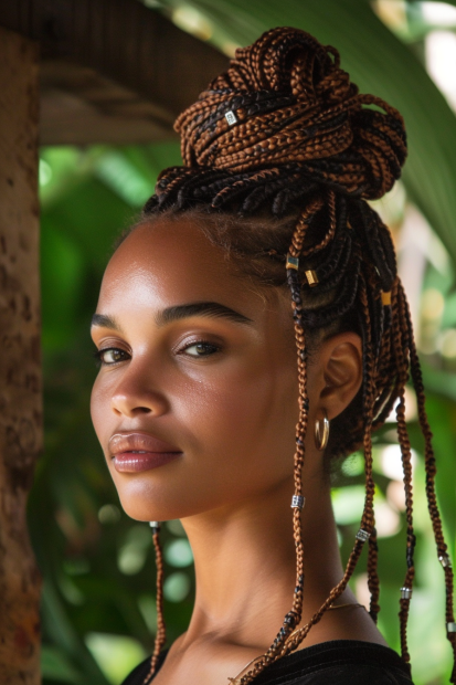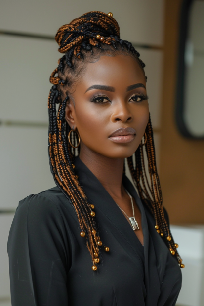 Boho Knotless Braids in a Playful Top Bun With Beaded Ends