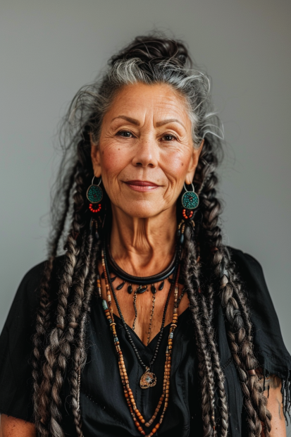 This stunning boho knotless braid style proves that beauty and confidence only get better with time. Long, voluminous braids cascade effortlessly, blending natural silver streaks with deep tones for a look that’s full of character and wisdom. Loose, wavy strands frame the face, adding softness and movement, while intricate jewelry and earthy accessories complete the free-spirited vibe. This style feels both timeless and deeply personal, perfect for those who embrace individuality and self-expression.