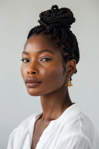 What I love most about this style is how it blends sophistication with just the right amount of edge. The high bun makes a statement, giving that “I woke up like this” level of confidence, while the knotless braids keep everything lightweight and comfortable. Paired with gold hoops and a tailored outfit, this is the ultimate power move in hairstyle form.