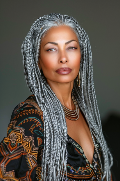 What I love about this look is how it embraces natural silver tones and turns them into a true statement. The braids add texture and depth, while the color gives an effortlessly chic, futuristic feel. It’s the perfect mix of bold and timeless, proving that great style only gets better with time. If you’re all about owning your beauty at any age, this is the ultimate power move.