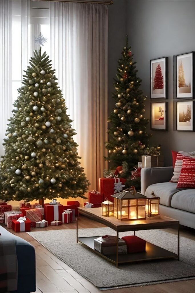 Minimalist trees, warm LED lights, Scandinavian decor, and eco-friendly elements like dried flowers or pinecones make homes feel peaceful and stylish.