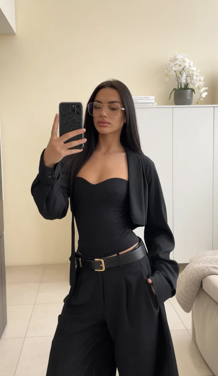 There’s something quietly powerful about an outfit that keeps things simple yet completely unforgettable. A structured black blazer layered over a sleek bodysuit instantly gives that confident, city-night energy. It feels a little mysterious, a little bold, and very ready for a women’s nightclub moment where the lighting is low and the music leans toward smooth Jazz or deep Techno beats. The clean silhouette, paired with relaxed trousers and a statement belt, creates a look that feels classy without trying too hard.