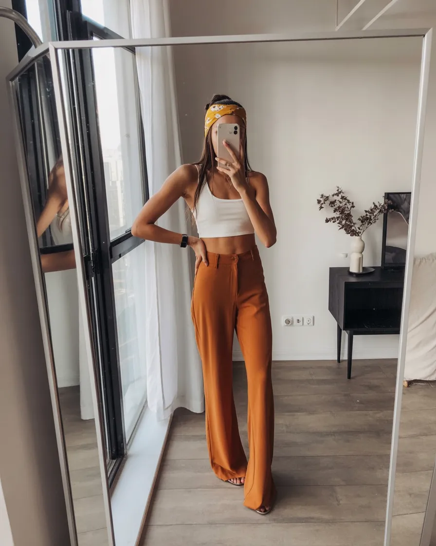 Some outfits instantly feel like sunshine, warm evenings, and spontaneous plans. The combination of a clean white crop top with flowing rust-toned trousers gives off that relaxed summer confidence. The headband adds a slightly nostalgic touch that feels inspired by early 2000s style, creating a look that’s playful yet effortlessly stylish. It’s the kind of outfit you could wear while getting ready at home, snapping a mirror selfie, and heading out to meet friends before the night unfolds.