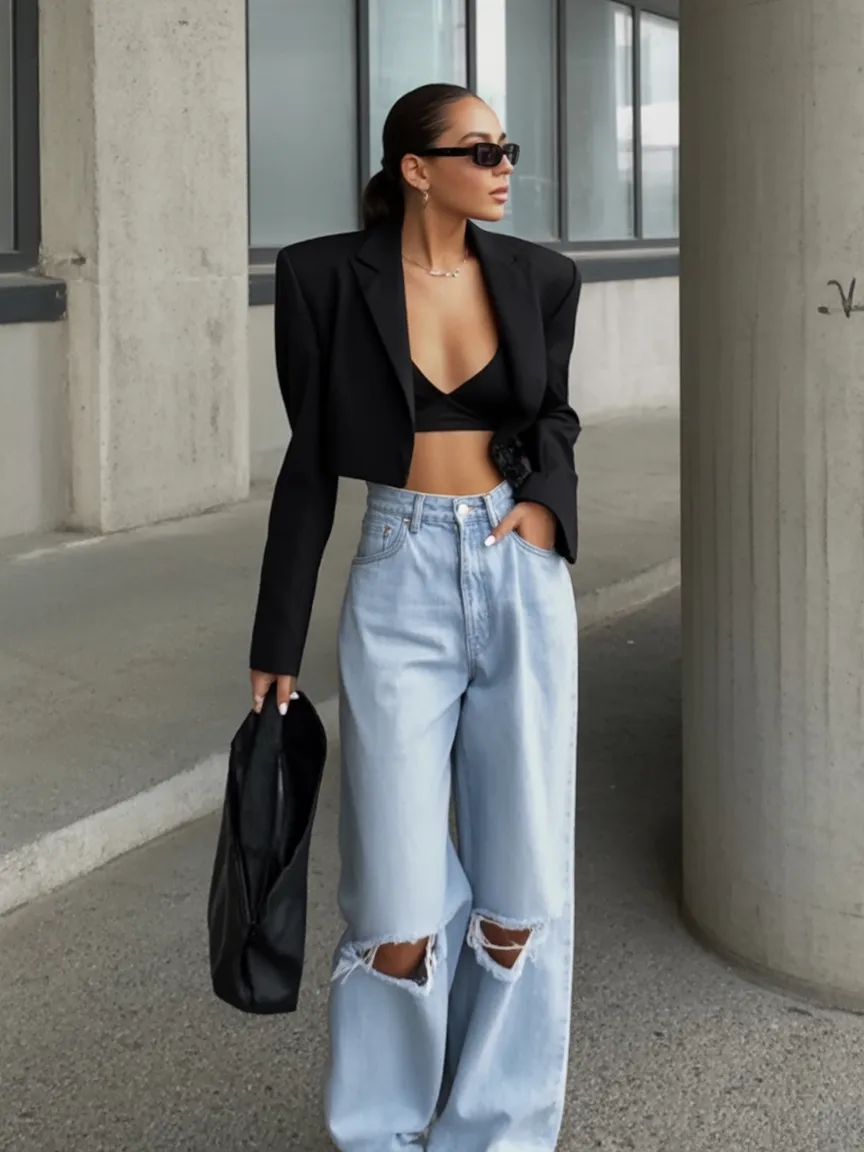 This outfit feels like a modern interpretation of the iconic Y2K club aesthetic. A cropped blazer layered over a minimal top creates a bold silhouette, while loose denim brings a relaxed street vibe. The combination feels confident and stylish, almost like something you’d see walking through downtown Miami before heading to a rooftop party or underground women’s nightclub.